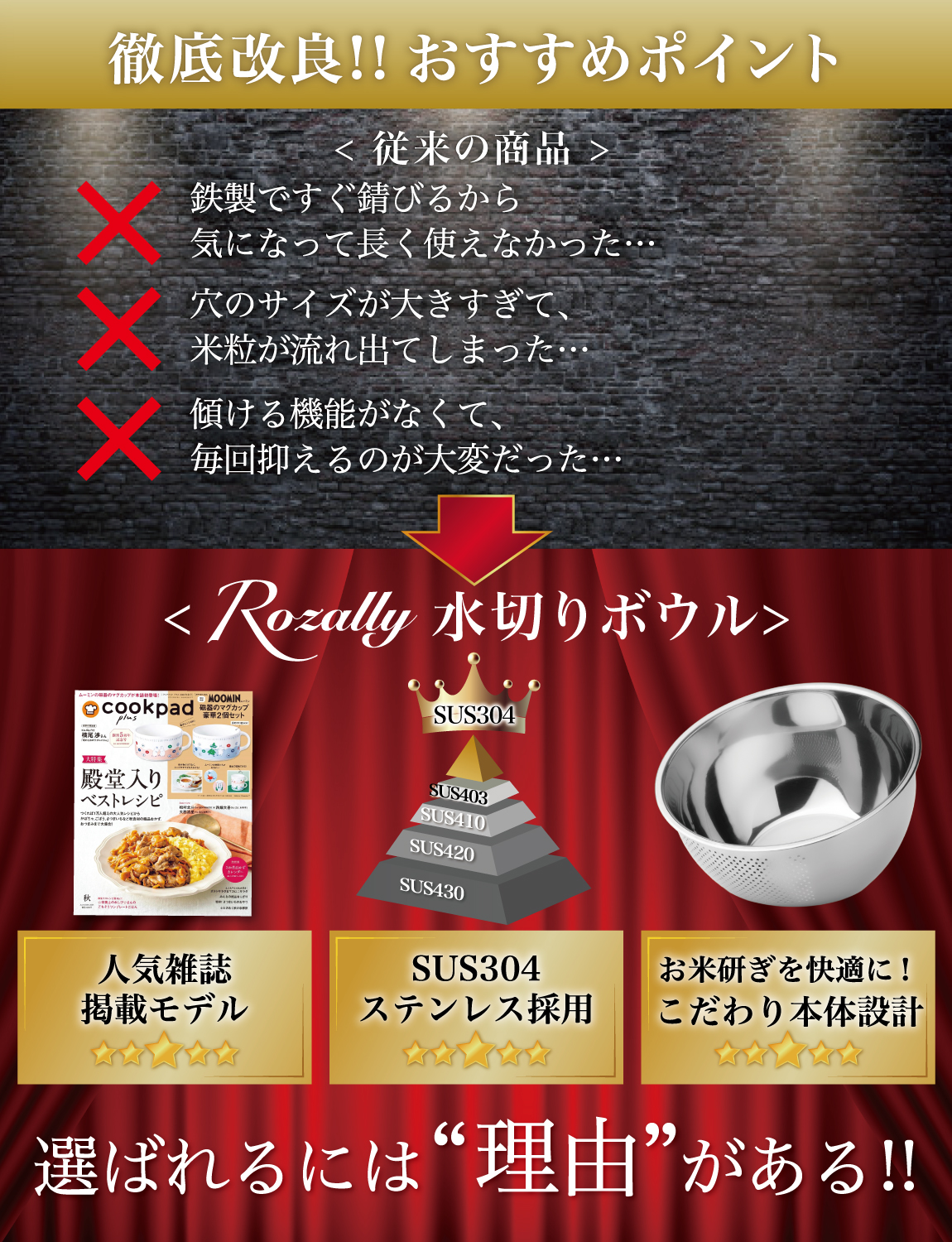 「米研ぎ に ザルだと米粒が流れ出る…」「ステンレス素材 で食洗機対応 のボウルが良い…」