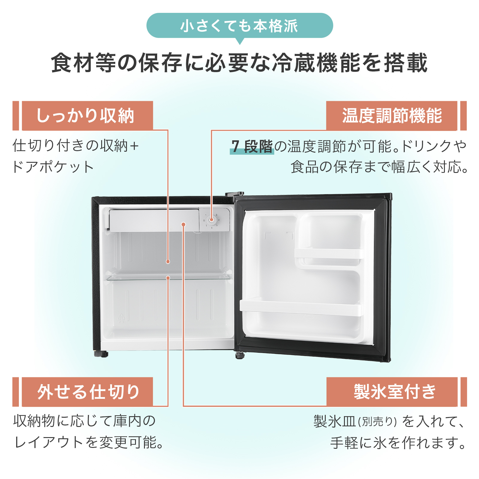 コンパクトなのに、しっかり入る50L、製氷室で氷を作ることも可能です!