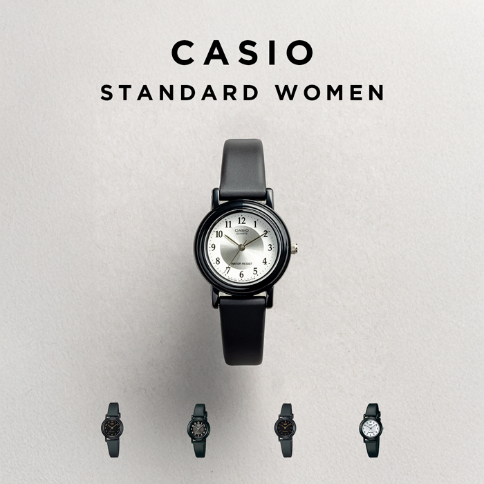 カシオLQ-139は、ブラックのラウンドケースが可愛らしい、スモールサイズの腕時計です。ケースには深みのある光沢処理が施されているため、樹脂製ながらも品のある佇まいとなっています。スムースレザー風の樹脂ベルトは、両サイドが丸く滑らかに成型されているため、見た目にも軟らかく、肌触りも滑らかです。分針と秒針が目盛の先までキッチリ届いており、文字盤のデザインもバランスよく整っています。 | |