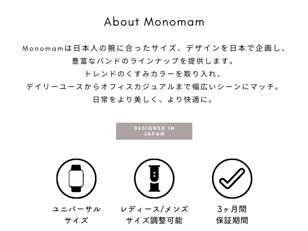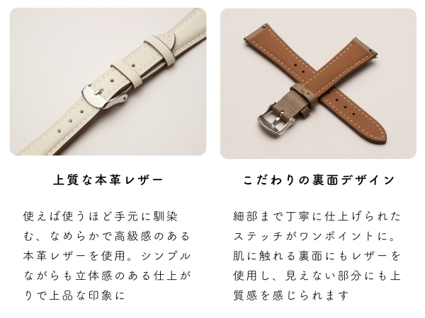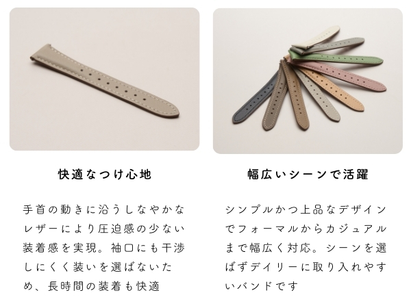 | 1)細身バンドで手元がすっきり。違和感のない丁度良い太さ 2)腕周り約16 - 21cmに対応 3)高級感溢れる本革レザーを使用。使えば使う程、手に馴染んできます。 4)留め具はユニバーサルデザインを採用。男女共に利用可能。 5)バンドの厚みは日本人の腕に馴染みやすい丁度良いサイズに。本革だからといって硬すぎず、柔らかく仕上がっています。 6)裏面にもこだわりました。本革ならではの味わいを背面のデザインからも感じる事ができます。 |