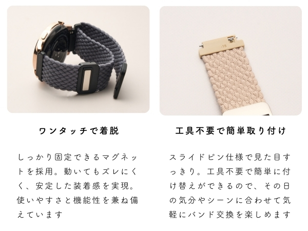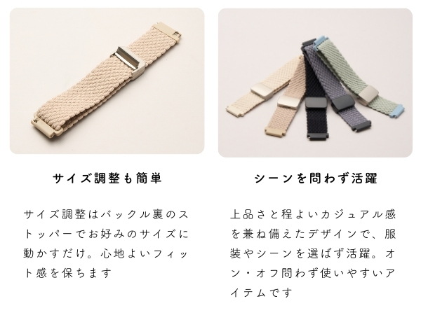 | 【大人かわいいナイロンマグネットバンド】 ふんわりもこもこの編み込みデザインが特徴のナイロンバンド。伸縮性のあるナイロン素材とマグネットバックルを採用し、使いやすさと快適さを兼ね備えています。人気の大人くすみカラーを中心にどんなシーンにも合うカラー展開。シンプルデザインのため男女問わず使用でき、ペア使いにもおすすめです。カラーによって編み方が異なるため、個性を楽しむことも可能です。スタイリッシュでありながら柔らかな印象を与えるこのバンドは、普段使い・アウトドア・スポーツなど幅広いシーンでお使いいただけます。高品質な素材を使用しているため、耐久性があり長く愛用できるのも魅力です。 【マグネットバックル】 強力マグネットバックルを採用し機能性とデザイン性を兼ね備えた実用的ナイロンバンドです。着脱もピタッと簡単ワンタッチで装着・取り外し可能!マグネットタイプのバックルは強力な吸引力で、しっかりと装着された状態を維持します。そのため、忙しい日常でも素早く装着できるため、使い勝手が抜群です。強力マグネットにより、アクティブな動きでも安心して使用できスポーツやアウトドアにもおすすめです。 【簡単サイズ調整】 ゴムのような伸縮性のある柔らかいナイロン素材を使用しており、どんな手首にもフィットします。肌触りも優しく、快適な付け心地。サイズ調整は工具不要で、バックル裏面のストッパーを解除しお好みのサイズに動かすだけの簡単サイズ調整ができます。一度調整するとその後はサイズ調整不要です。腕を通してマグネットバックルでカチッと止めるだけで簡単に着脱できます。また、ゴムのような伸縮性があるため、マグネットバックルを外さなくても着脱可能でき、忙しい日常でも便利に使用できます。 【快適な付け心地】 軽量で柔らかく快適な付け心地が特徴のこのナイロンバンドは、長時間つけても疲れにくい設計です。伸縮性のある柔らかいナイロン素材を使用しており、編み込みデザインで通気性が良く蒸れにくいです。速乾性に優れているナイロン素材なので汗や水に濡れても安心で濡れてもすぐに乾きます。汗や水に強いため、日常使いはもちろんアウトドア・スポーツシーンなどにも最適です。機能性と快適さを兼ね備えたこのバンドは、日常からアクティブな活動まで幅広く活躍します。 |