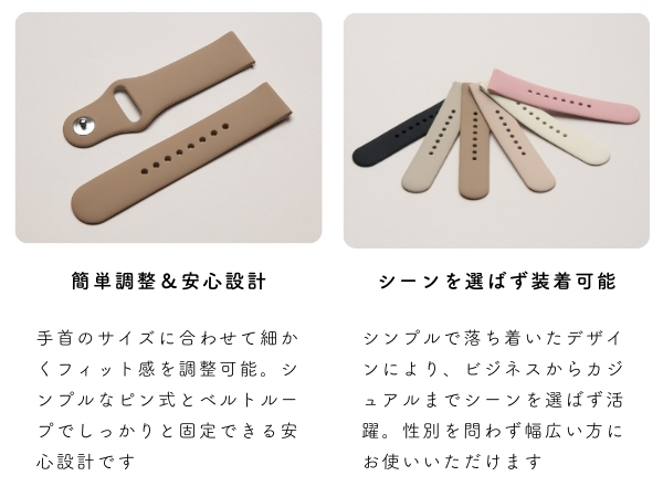 | 1)人気の大人くすみカラーを中心にどんなシーンにも合うカラー展開 2)メンズ、レディース問わずユニセックスにお使いいただけます 3)肌触りが良く快適な着け心地 4)軽量で長時間着けても疲れにくい 5)細かなサイズ調整ができワンタッチボタンで着脱も楽々 6)汗や水に強いシリコン素材で汚れたら水洗いできお手入れ簡単 |