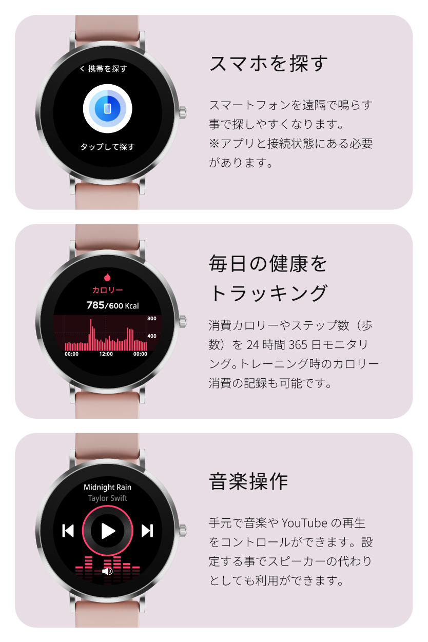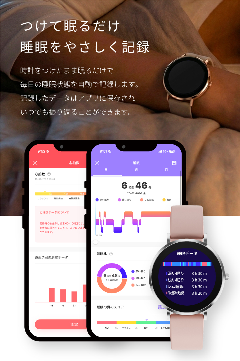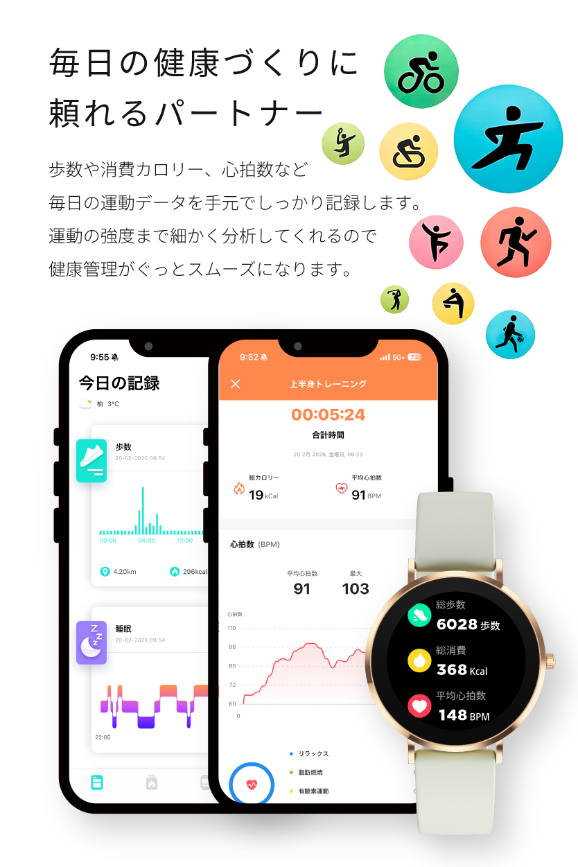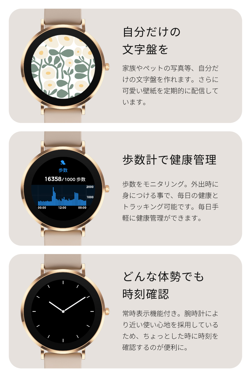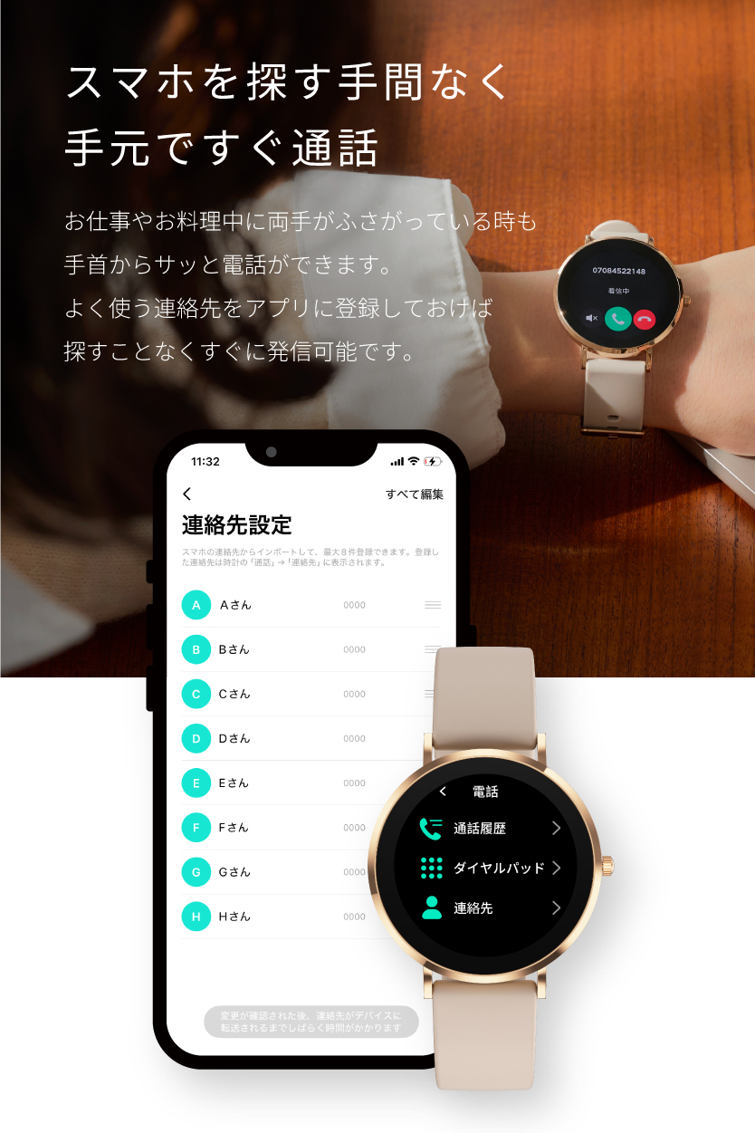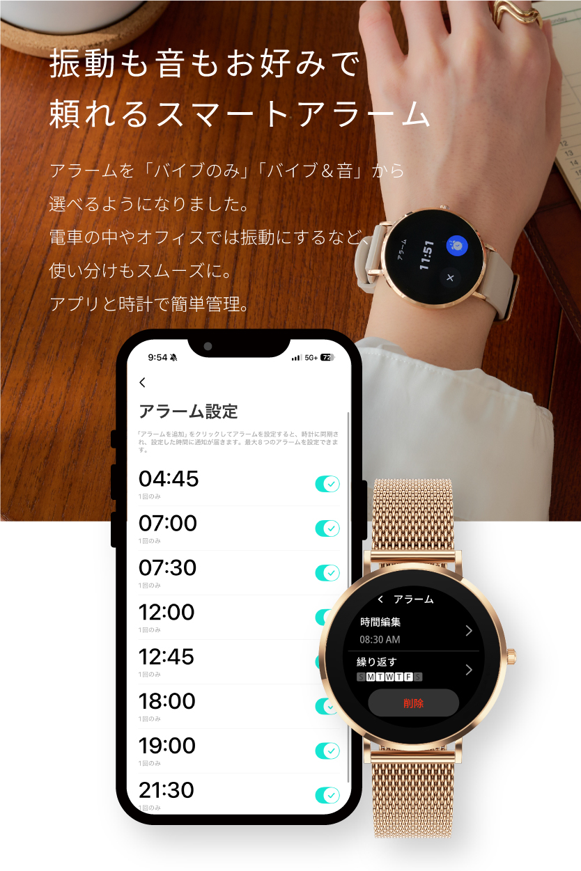 | 【スマホを探さずに手元でらくらく通話】 お料理や買い物で両手がふさがっている時、バッグの中からスマホを探すのに苦労していませんか?このスマートウォッチがあれば、手元でサッと電話に出る・かけることが可能です。アプリを通じて、よく使う連絡先を最大8件まで同期。登録した相手にはワンタップですぐに発信できるため、忙しい日常の小さなストレスを解消します。スマホを取り出す手間を省き、より自由で軽やかなコミュニケーションをサポートします。 【本来の時計の美しさと使い心地。常時表示×極薄ボディ】 「スマートウォッチは、もっと薄く、時計らしくていい。」そんな理想を形にしました。厚さわずか0.71cmの極薄設計に、日本企業としてのこだわりを凝縮。ハイランクなAMOLEDディスプレイを採用し、鮮やかな発色と深い黒の表現力を実現。屋外の日差しの中でも、文字をクリアに映し出します。さらに、待望の常時表示機能を搭載。デザインは前作の3倍となる6種類に進化し、アナログ・デジタル等お好みの壁紙と組み合わせ可能です。どんな姿勢でもサッと時間を確認できます。 【「バイブのみ・音有り」シーンに合わせて選べるアラーム機能】 ユーザー様からの「アラームを音でも鳴らしたい」という熱いご要望にお応えし、アラーム・バイブレーション機能を大幅にアップデートしました。「バイブのみ」、または「バイブ&音」の2パターンから自由に選択が可能。電車内や静かなオフィスではバイブのみでスマートに、朝の起床時や確実に気づきたい時は音出し設定で、とシーンに合わせた使い分けができます。設定は専用アプリからはもちろん、スマートウォッチ本体からも直接操作OK。日常のあらゆる場面で、あなたのスケジュール管理を快適なものに変えてくれます。 |