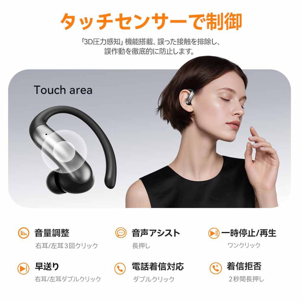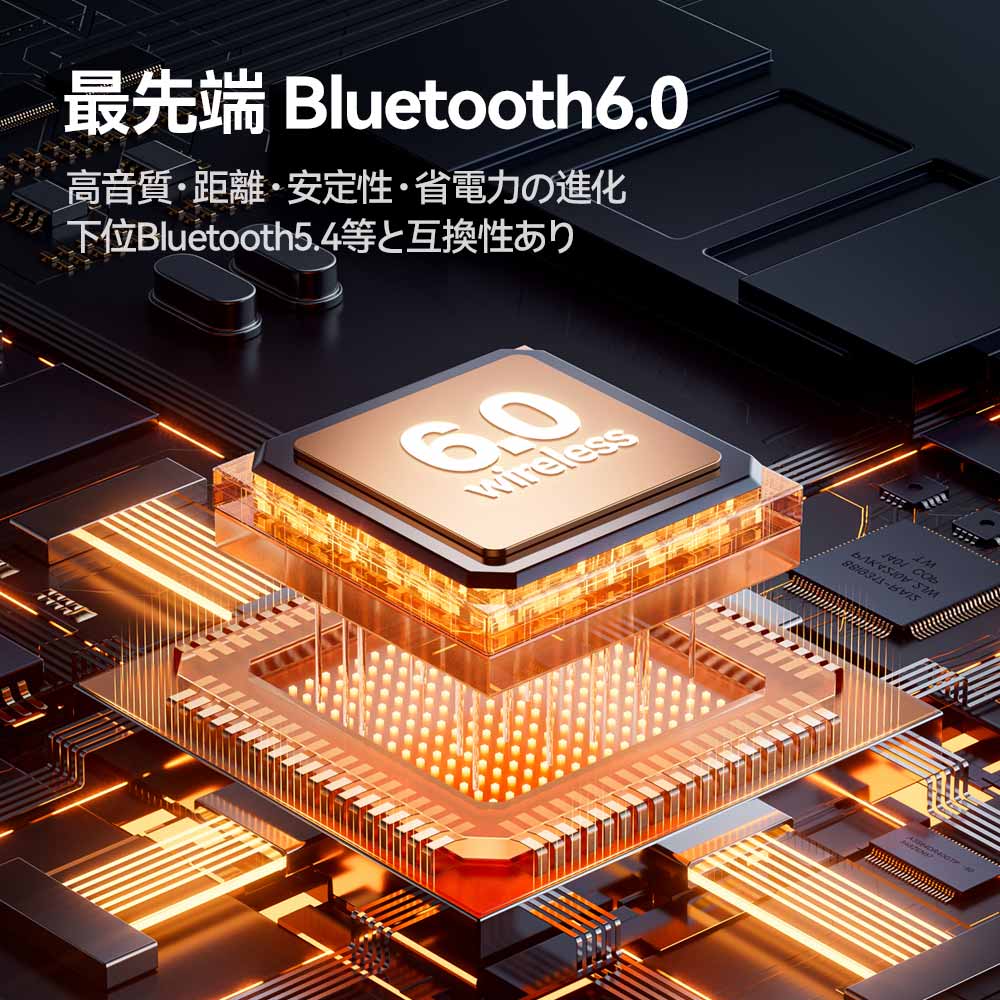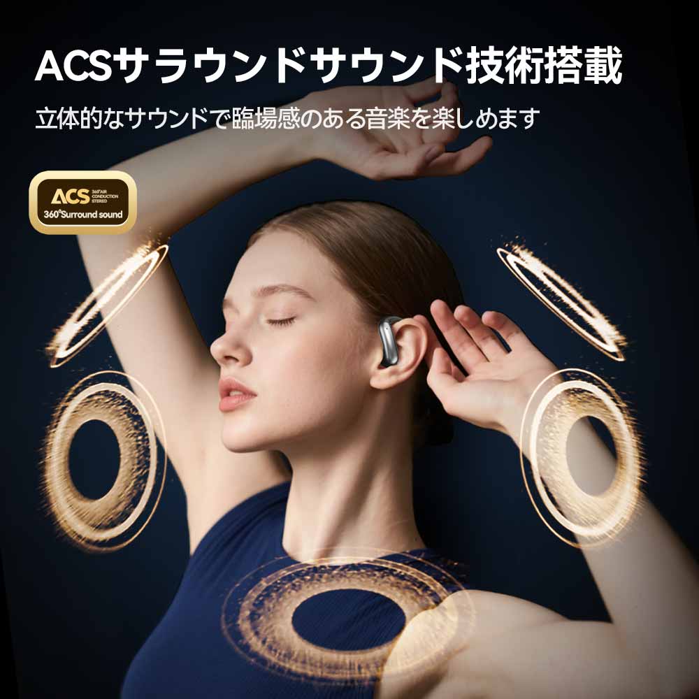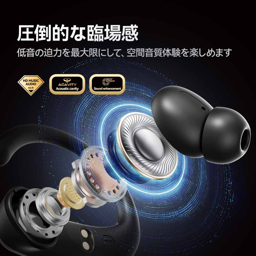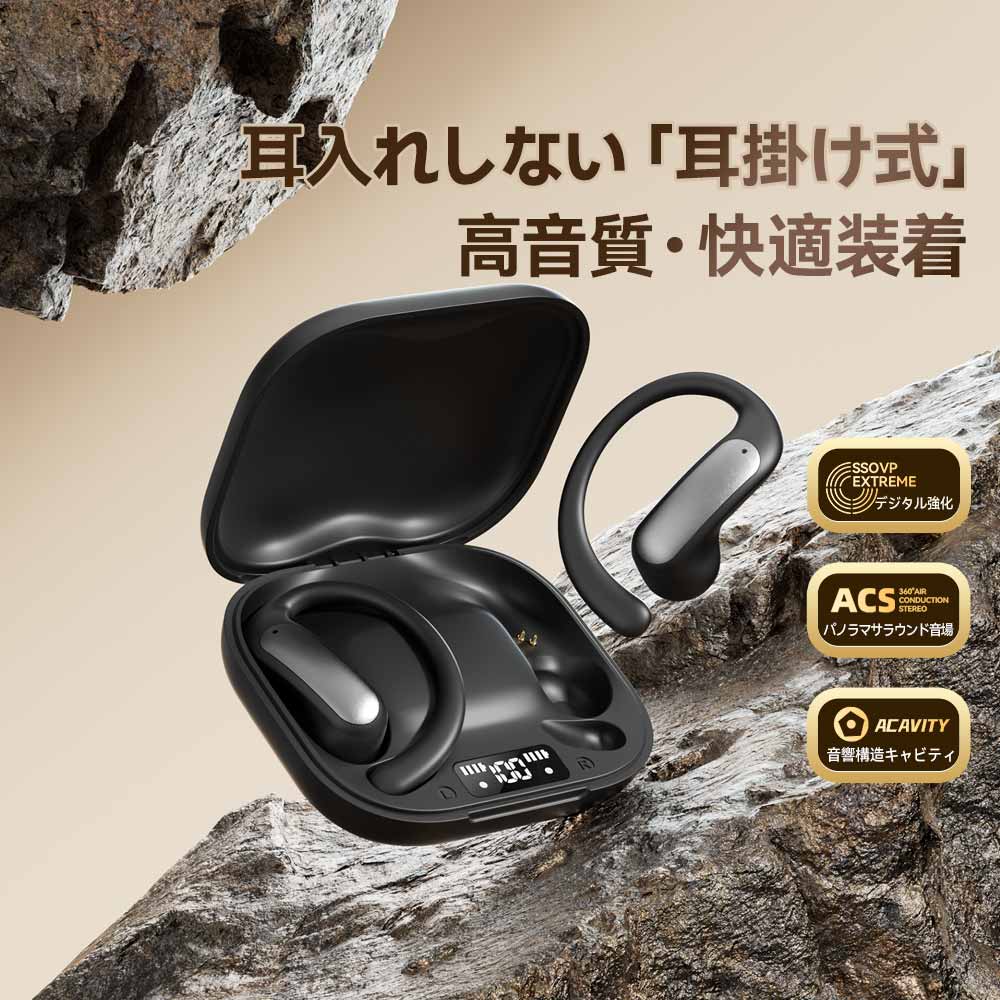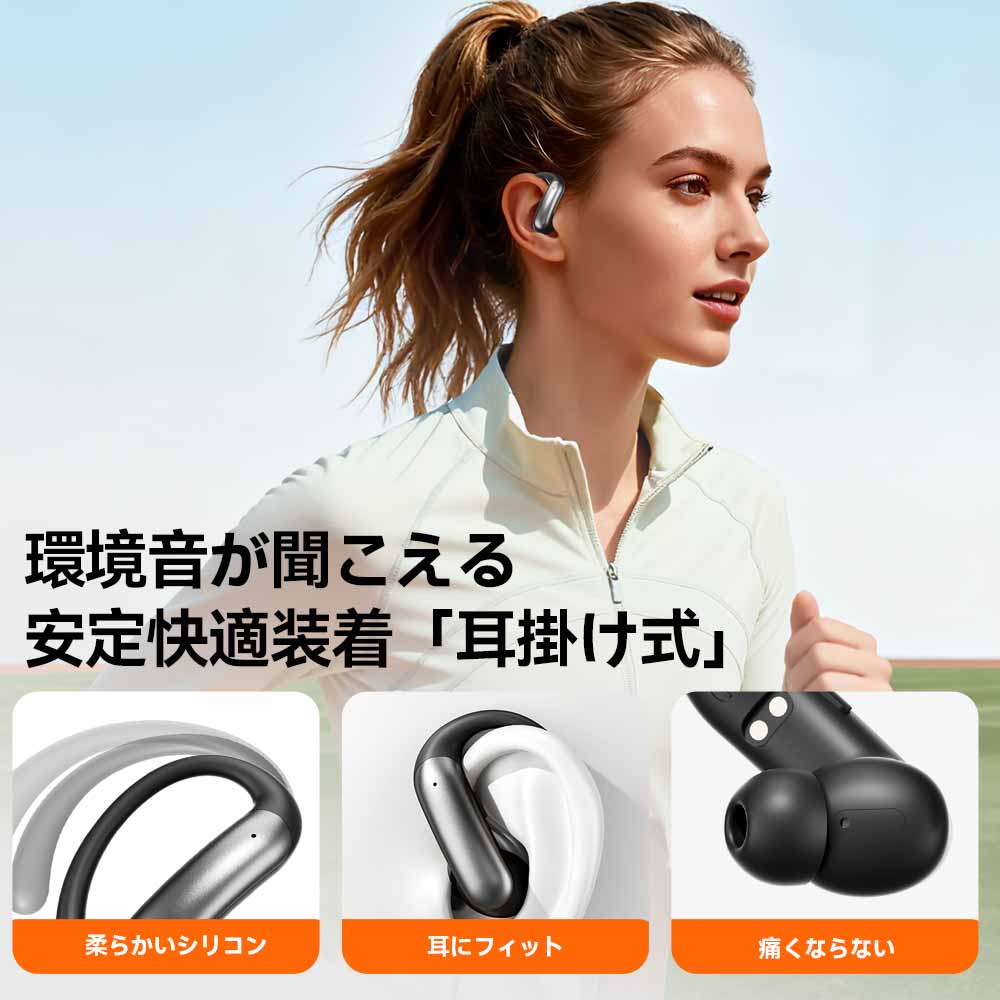 最新型の「耳掛け式」ワイヤレスイヤホン、Bluetooth6.0/5.4搭載、耳を塞がない設計と快適な装着感、臨場感のある360°全方位サラウンドサウンドを再現し、迫力のある重低音と繊細な高音域を実現、音楽も通話もクリアで没入感のある体験を提供します。