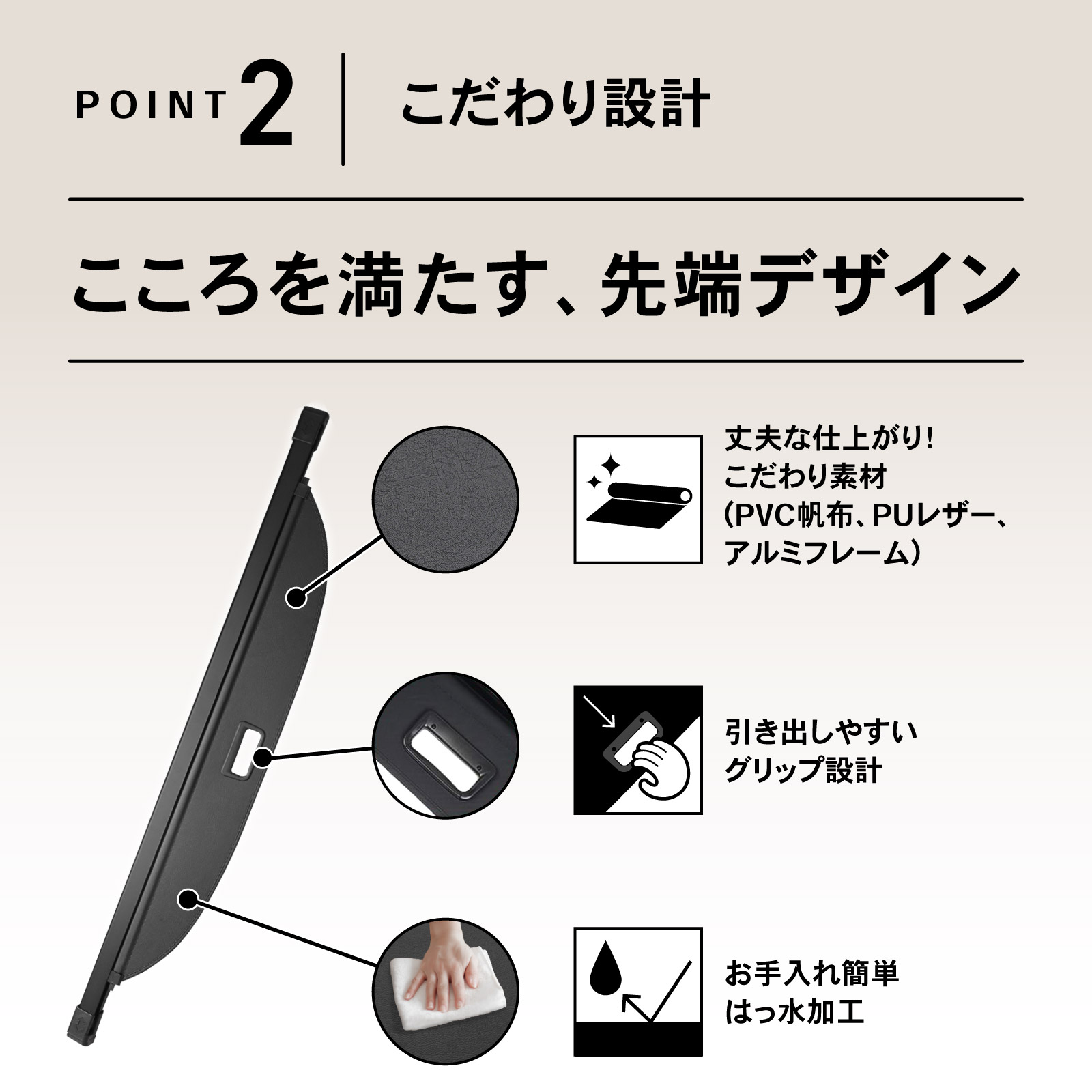 | 商品説明 | 日々のはしりを、悠々と。 専用設計T33。選べる3種。X-TRAILトノカバー。 こんなお悩みの方にオススメ! 収納エリアを拡げたい・・・ 手の届く場所に荷物を置きたい・・・ ラゲッジルームを覗かれているかも・・・ ・POINT.1 「タフギア専用。」 ・想像以上の一体感。 丁寧な現車採寸による完全車種別専用設計。 車種本来の雰囲気も崩さない。T33系トノカバー。 ・POINT.2 「こだわり設計。」 ・心を満たす、上質デザイン。 ユーザー目線にこだわって、カーライフはより優れたものに。 ------------------------------------------------------------ (こだわりポイント) 1.丈夫で長持ち。『こだわり素材』 2.引き出し易い。『グリップ設計』 3.お手入れ簡単。『はっ水加工』 ------------------------------------------------------------ ・POINT.3 「取付簡単。」 ・穴あけ不要、工具無用。 完全車種別専用設計なので、取付も簡単。 車体に穴をあけることもなければ、特殊な工具も不要です。 ---------------------------------------------------------------------------------- (取付・使用手順) 1.荷室奥の予備ホールに本体を挿し込みます。 2.カバーを引き出し、手前の予備ホールに引っ掛けます。 ---------------------------------------------------------------------------------- ・POINT.4 「しっかり目隠し。」 ・荷室を覆って、防犯効果も。 トノカバーがラゲッジルームをすっぽりカバー。 プライバシー保護はもちろん、盗難防止効果も期待出来ます。 ・POINT.5 「選べる3タイプ。」 ・「PUレザー」「PVC帆布」「カーボンファイバー」3種をご用意。 お客さまの目的・スタイルに合わせた、タイプ選択が可能です。 いつもの荷室を、グレードアップ。 こだわり満たす、先端デザイン。X-TRAIL(T33)トノカバー。 (このような商品をお探しのかたに) 日産 nissan エクストレイル T33 トノカバー ラゲッジ 収納 ロールシェード 取付簡単 プライバシー ドレスアップ カスタムパーツ インテリア 室内 車内 アクセサリー タフギア 専用 X-TRAIL 設計 おすすめ カバー 荷室 空間 アップ 日焼け防止 防水 耐高温 選べる 3 タイプ PU レザーPVC 帆布 カーボンファイバー |