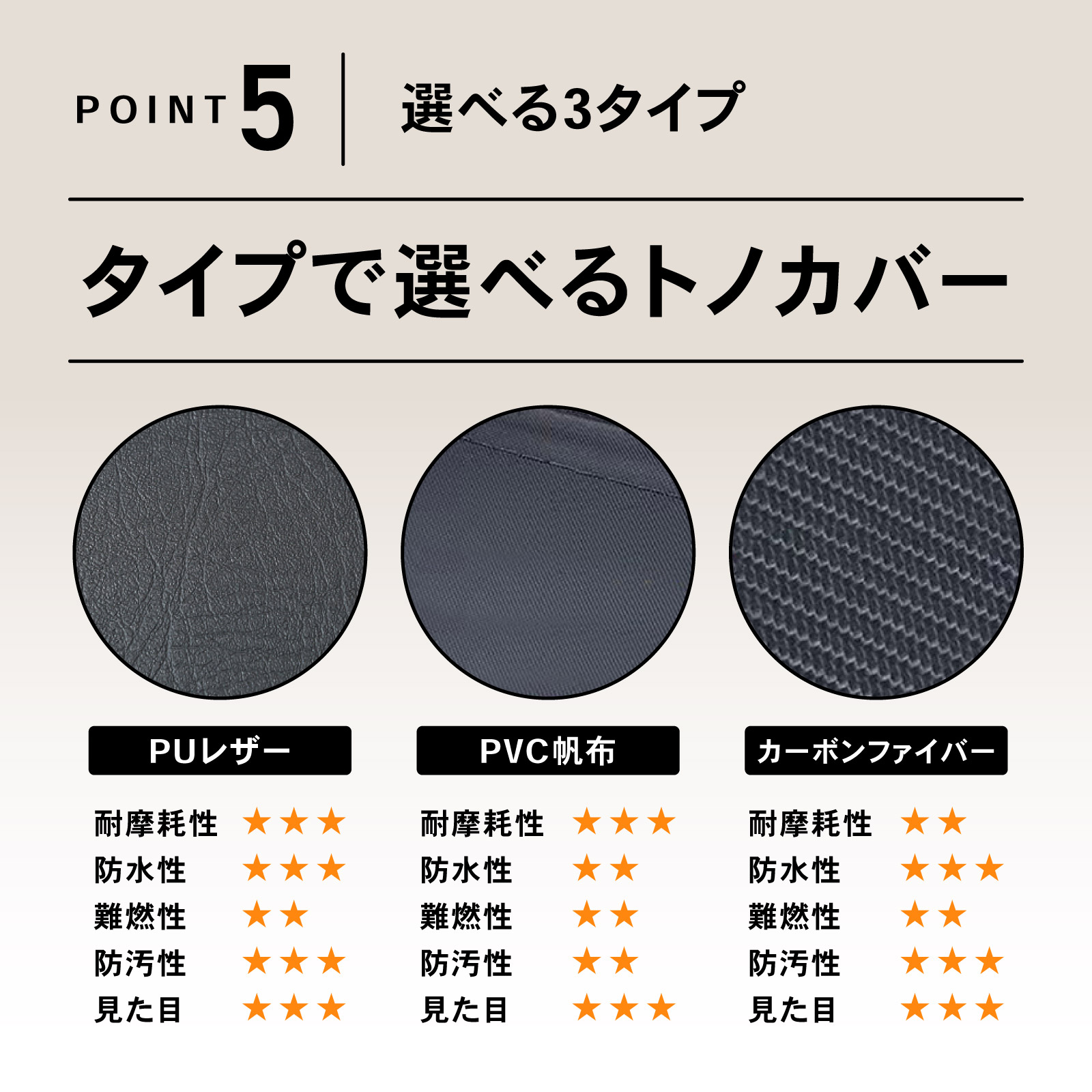 ・カバータイプ:PUレザー、PVC帆布、カーボンファイバー