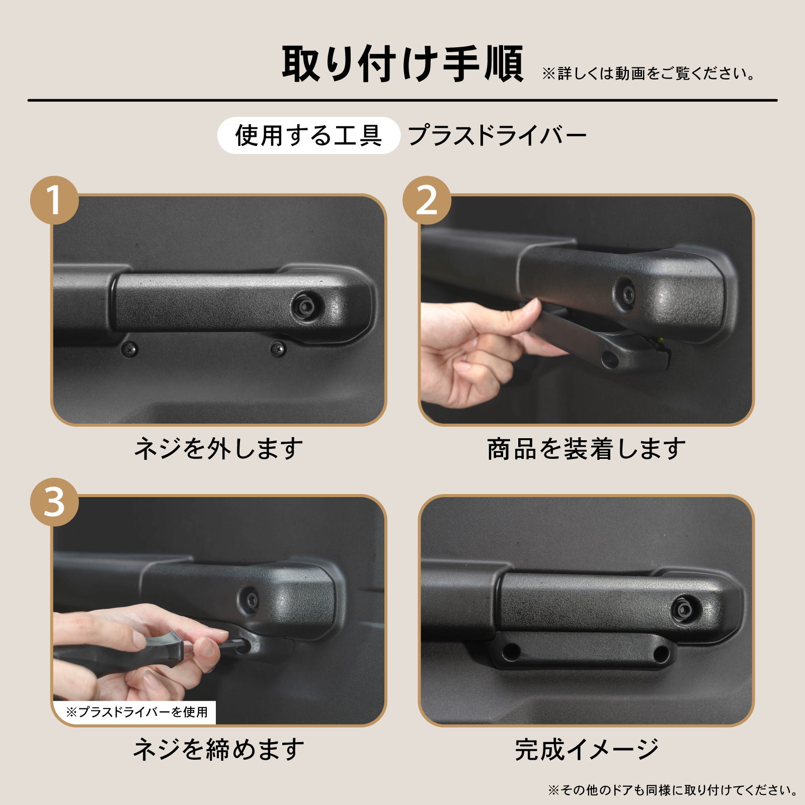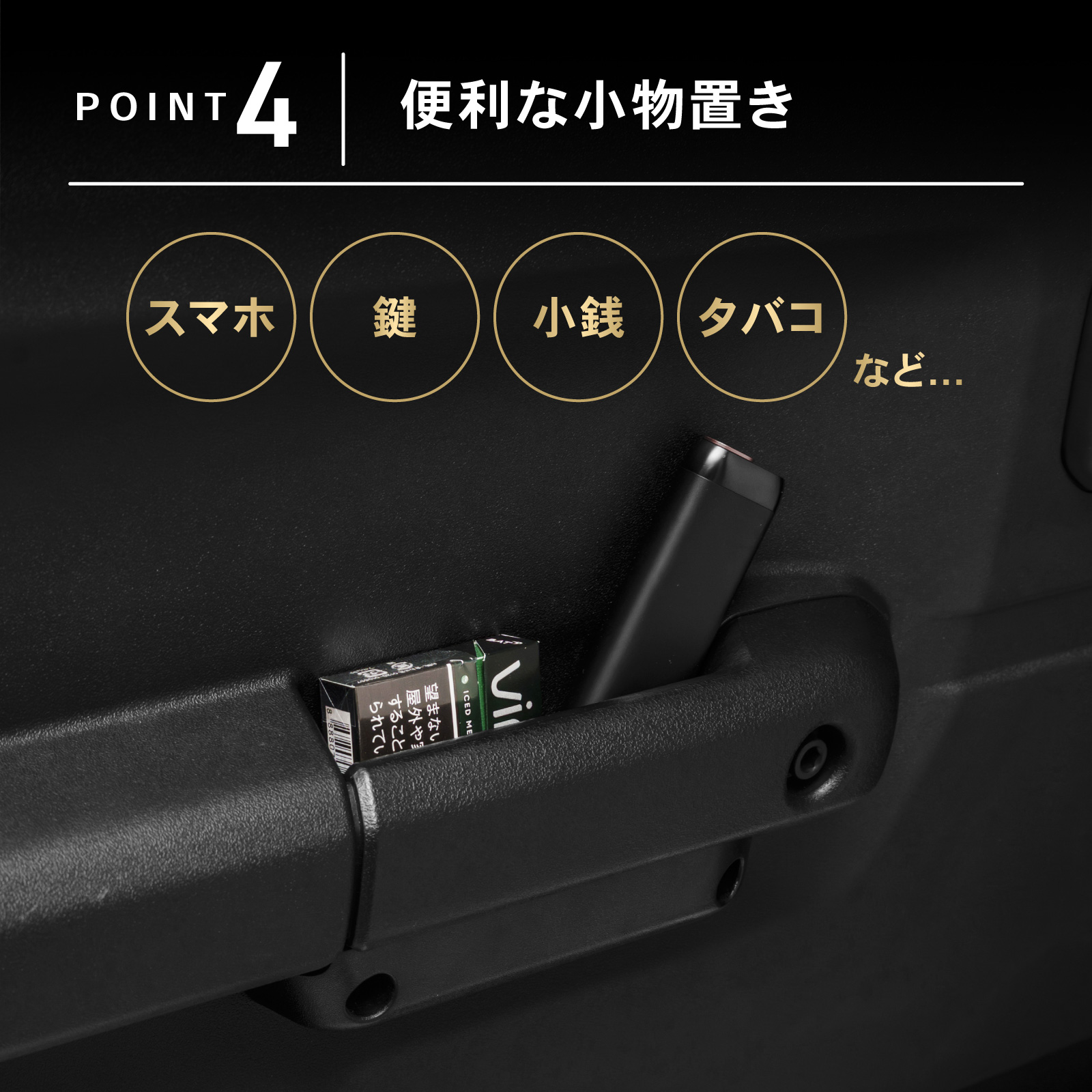 | 特徴 | ドアグリップそのままポケット追加! 握る部分が狭くならない ・POINT.1 「ジャストフィット」 自動車整備士が現車でフィッティングを行っています。 ・POINT.2 「ラクラク取り付け」 プラスドライバーのご用意にてご自分で設置できます。 純正ネジをそのまま利用! ・POINT.3 「耐久性に優れたABS樹脂」 純正に馴染むデザイン ・POINT.4 「便利な小物置き」 スマホ、鍵、小銭、タバコなど... ・POINT.5 「なくてもいいけど、あった方がいい!」 パーキングから出る時 小銭で支払う時 ジムニー簡単にできるおすすめカスタム! |