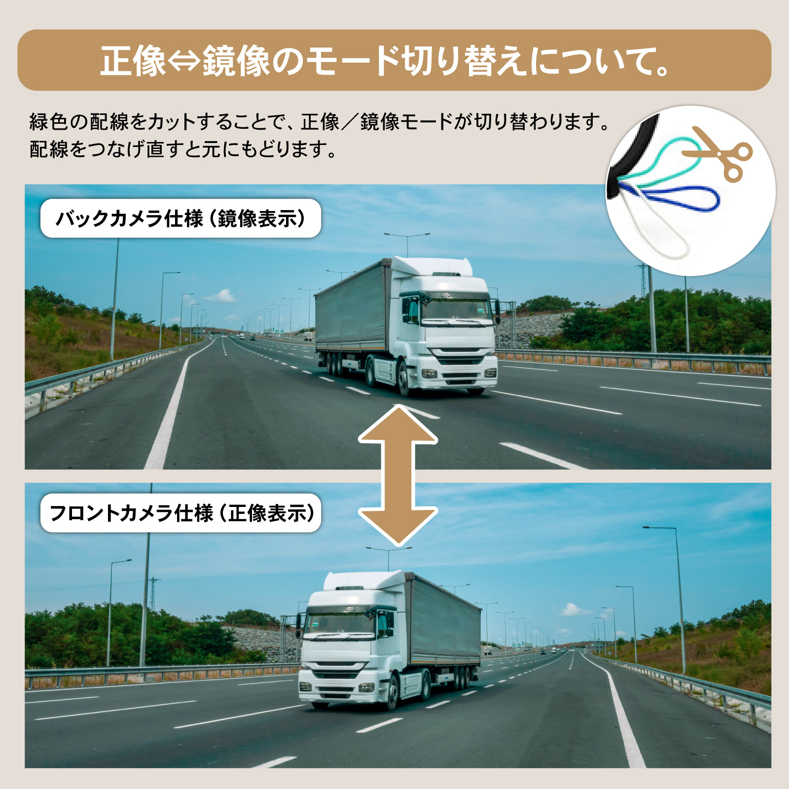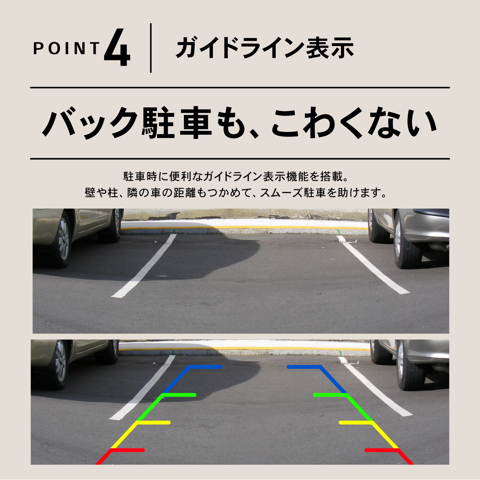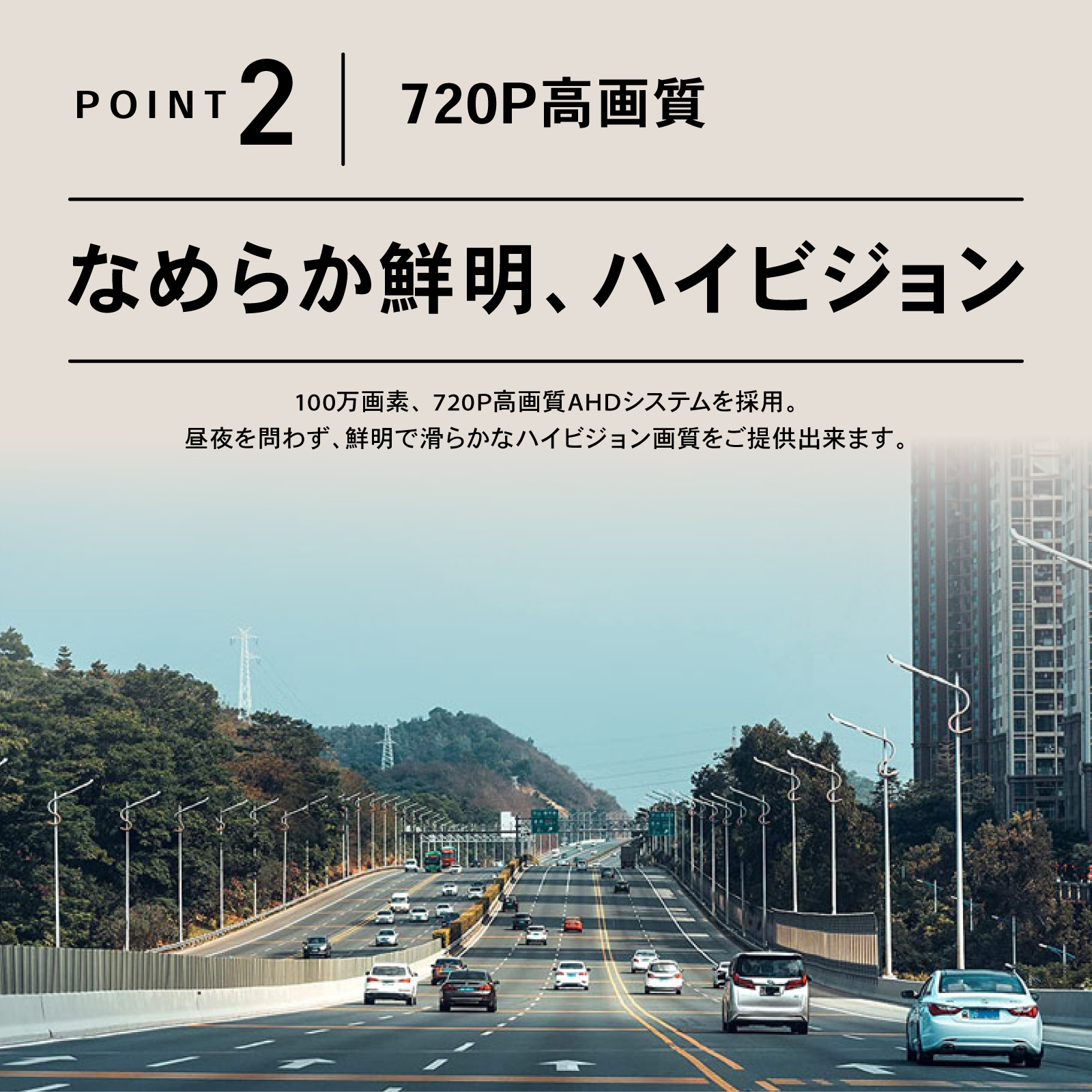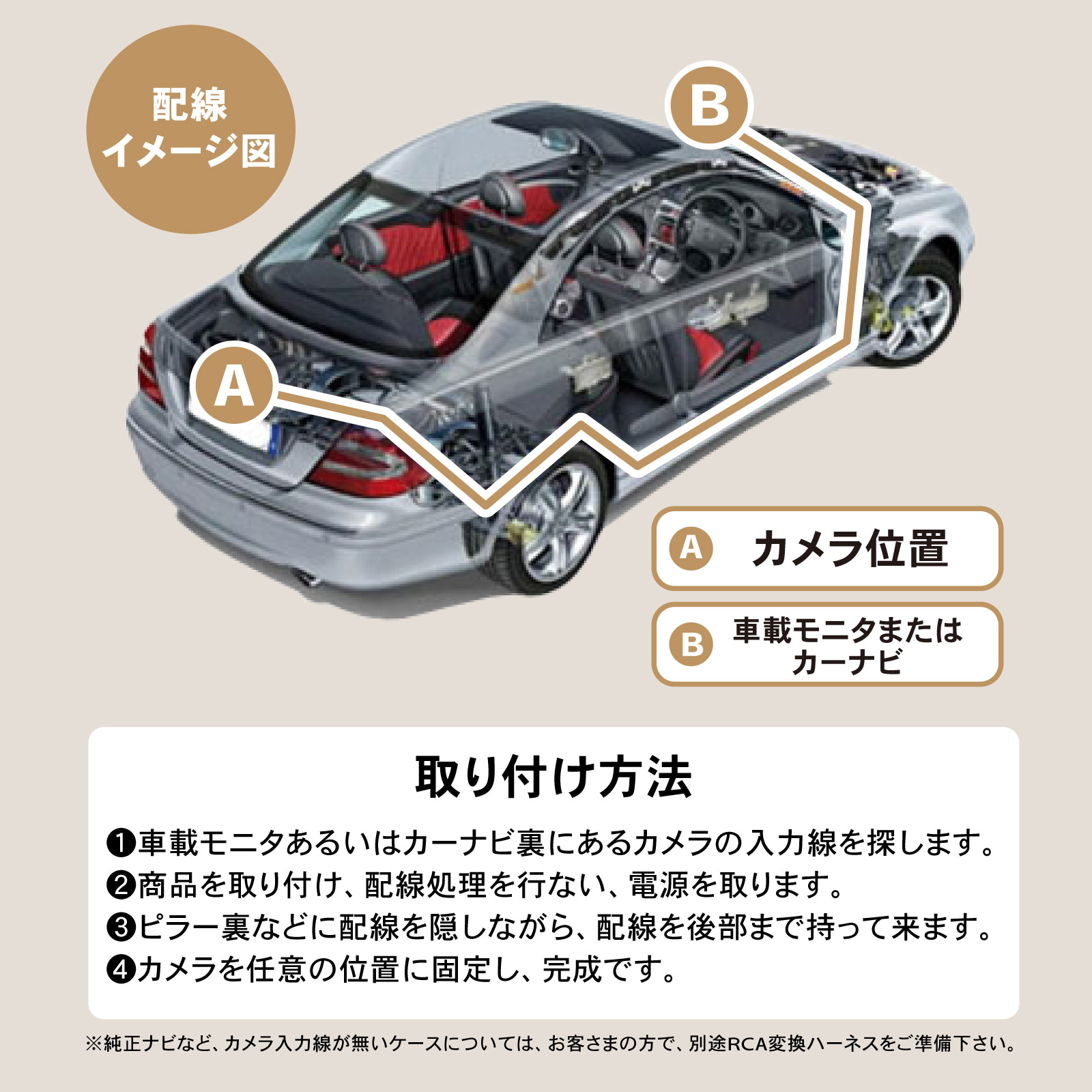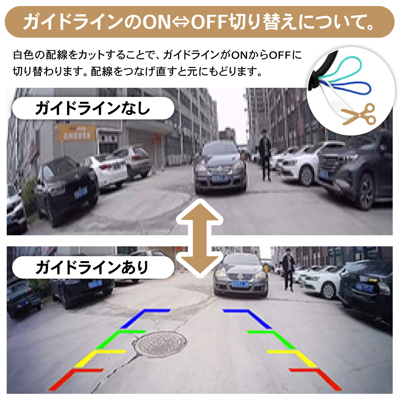 | 商品紹介 | 広角レンズが、死角をカバー。 720P高画質、防水IP68。車用バックカメラ。 ・POINT.1 「死角激減、広角レンズ。」 ・柱の位置が分からない…? 隣りの車に当たりそう…? もしも後ろに誰かがいたら…? そんなお悩みも、広角170°魚眼レンズがしっかりカバー。 スムーズなバック駐車をサポートする、後付け車載カメラです。 ・POINT.2 「なめらか鮮明、高画質。」 ・100万画素&720P高画質のAHDシステムを採用。 昼夜を問わず、鮮明なハイビジョン画質をご利用頂けます。 *AHD⇒CVBSのモード切り替えについて。 ・本製品はCVBSモードにも対応、切り替え手順は次の通りです。 (1) カーナビの電源をOFFにします。 (2) カメラ側の青色の配線をカットします。 (3) 配線カット後、カーナビを再起動します。 *CVBSからAHDモードに戻す場合は、(2)でカットした配線を繋ぎ直せばOKです。 *ご購入前には必ず事前に、お使いのモニタ仕様をご確認下さい。 ・AHDディスプレイ:AHDモードのみで使用可能。 ・CVBSディスプレイ:AHD⇒CVBSに切り替えて使用可能。 (CVBS切り替えには、ナビの設定画面でNTSCにモード調整する必要が御座います) *AHD/CVBSとは? ・AHD:Analog High Definitionの略。アナログシステムでハイビジョン画質を提供するためのシステムです。 ・CVBS: Composite Video, Blanking, and Syncの略。映像を構成する各種の信号を合成して1本のケーブルで扱えるようにした信号のことです。 ・POINT.3 「雨でもOK、防水IP68。」 ・密閉性をグッと強化、効率的に内部チップを保護。 防水性と防塵性、それに長寿命化に成功した汎用リアカメラです。 *IP68とは? ・IEC(国際電気標準会議)の定める電気製品の防塵・防水性能を表す規格「IPコード」の等級を示す記号です。 ・防塵性能は最高の6で塵埃の侵入がなく、防水性も最高の8で水中に沈めても機器が影響を受けないことを示しています。 ・POINT.4 「とっても便利な、ガイドライン表示。」 ・駐車時に便利な、ガイドライン表示機能を搭載。 壁や柱、隣の車の距離もつかめて、スムーズ駐車をサポートします。 *ガイドラインのON⇔OFF切り替えについて。 本製品は、ガイドライン表示をOFFにすることも可能です。 白色の配線をカットすれば、表示がONからOFFに切替わります。 表示をONに戻す場合は、配線をつなげ直して下さい。 ・POINT.5 「フロントカメラにも。」 ・簡単な配線作業で、正像/鏡像切り替え可能。 正像表示にすれば、フロントカメラとしてのご利用も可能です。 *正像⇔鏡像のモード切り替えについて。 緑色の配線をカットすれば、正像/鏡像モードが切り替わります。 元のモードに戻す場合は、配線をつなげ直して下さい。 ・POINT.6 「取付けも簡単。」 ・一般的なピン端子仕様で、各種モニターへの接続は簡単。 電源ケーブルに取付ネジ、6mの映像ケーブルも付属し、簡単なお取り付けが可能です。 -------------------------------------------------------------------------------------- (取付け方法) (1) 車載モニタ or カーナビ裏のカメラ入力線を探します。 (2) 商品を取付け、配線処理を行ない、電源を取ります。 (3) ピラー裏などに配線を隠しながら、配線を通します。 (4) カメラを任意の位置に固定し、完成です。 -------------------------------------------------------------------------------------- *純正ナビなど、カメラ入力線が無いケースについては、お客さまの方で、別途RCA変換ハーネスをご準備下さい。 170°広角で、死角なし。 あなたの駐車をしっかりサポート。 付けててよかった。後付け車載バックカメラ。 (このような商品をお探しのかたに) 車載 バックカメラ バックモニターカメラ100万画素 12v バック 後付け モニター 車 正像 鏡像 切り替え 車載カメラ ピン端子 CCD 広角 フロントカメラ 汎用 カメラ リアカメラ 超小型 高画質 カーナビ接続 後付け バック カメラ 小型 |