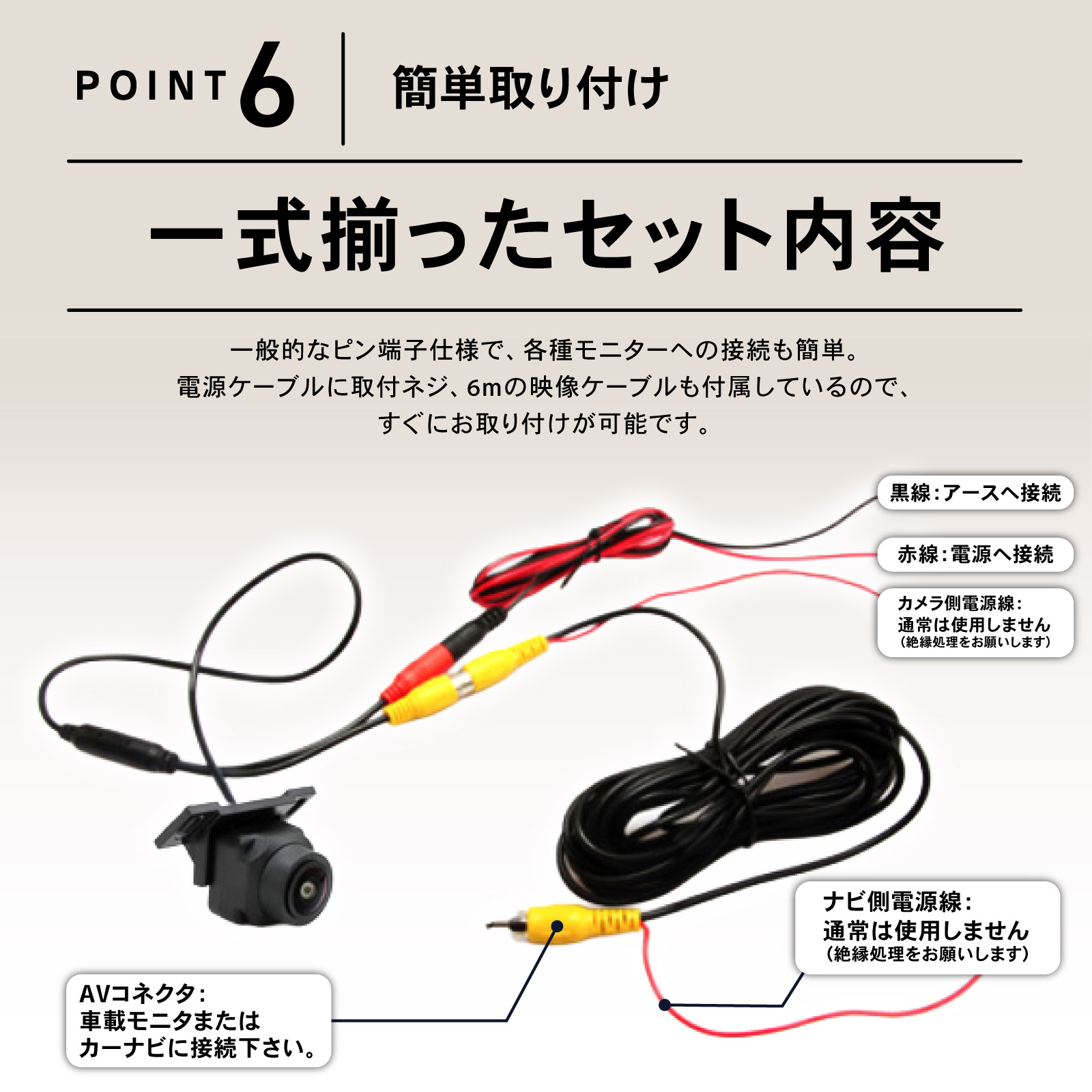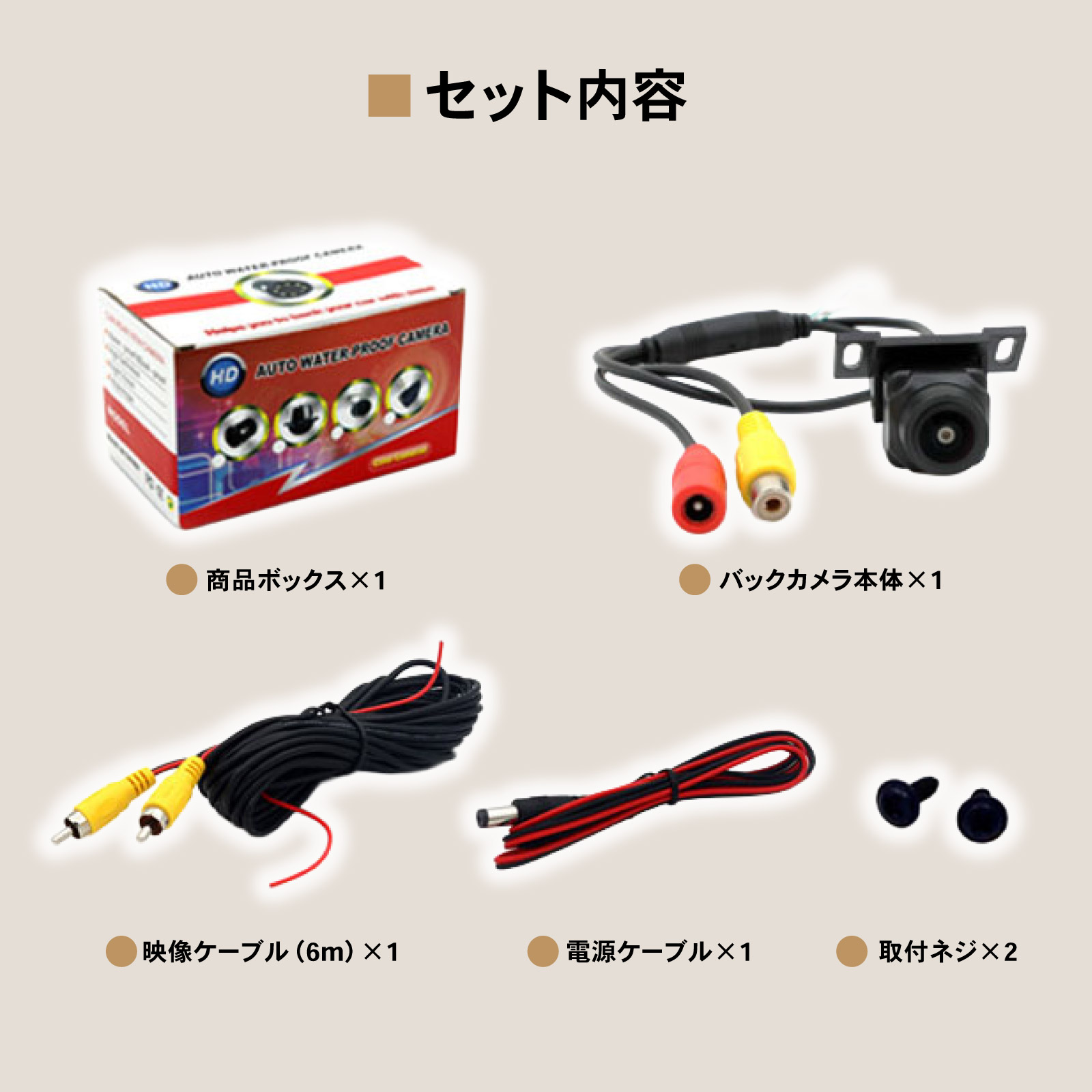 ・セット内容:カメラ本体 1、電源ケーブル 1、映像ケーブル(6m) 1、取付ネジ 2