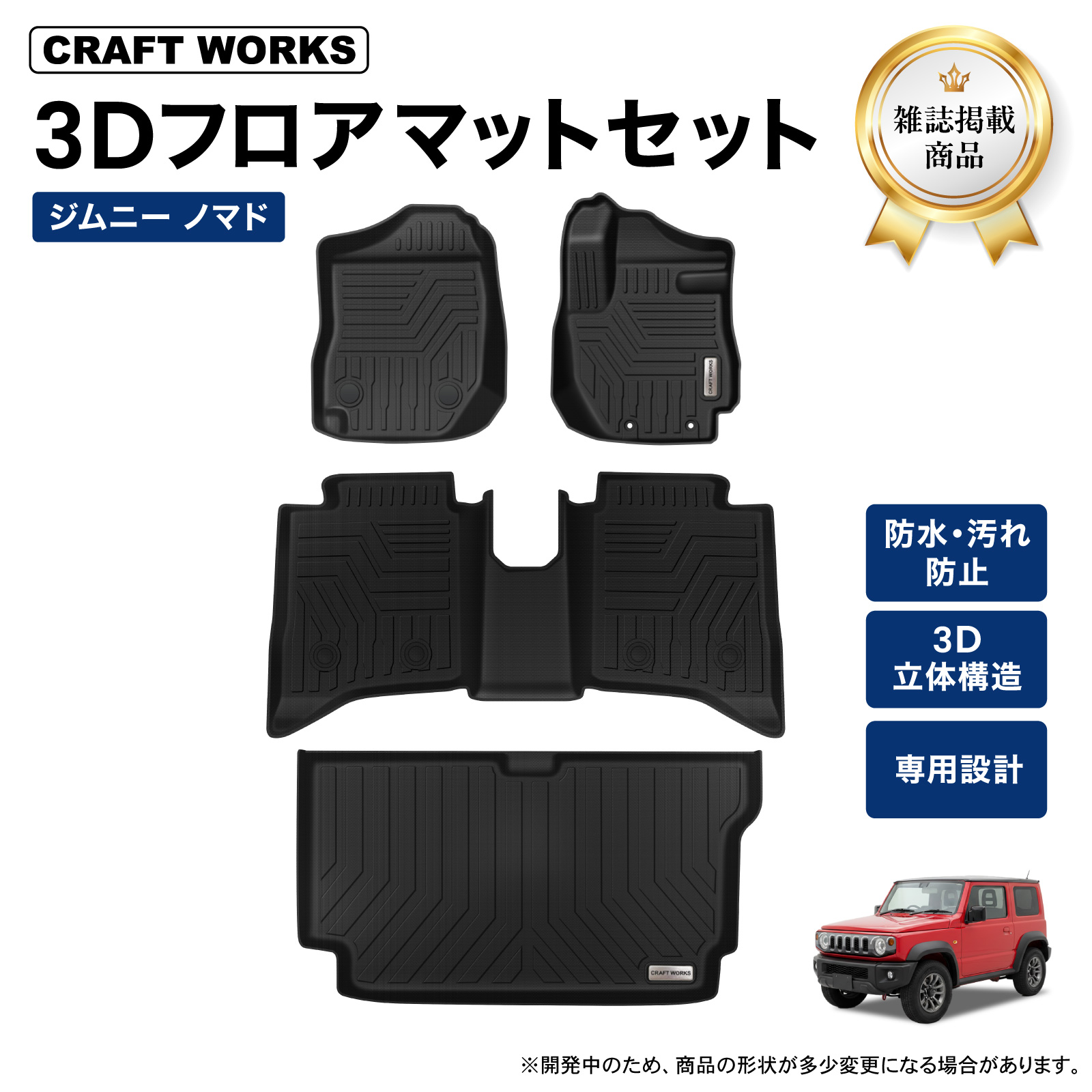 | 商品詳細 | [適合車種] SUZUKI/スズキ JIMNYNOMADE/ジムニーノマド [適合型式] JC74W(5ドア) [適合グレード] FC(5MT)、FC(4AT) [適合年代] 2025(令和7)年4月〜 [商品素材] ・TPE [商品構成] ・フロアマット 3枚 ・ラゲッジマット 1枚 |