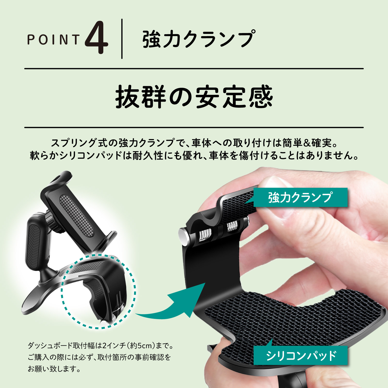 注1:ダッシュボード取付幅は2インチ(約5cm)までです。事前に 取付箇所ご確認の上、ご購入の方お願い致します。