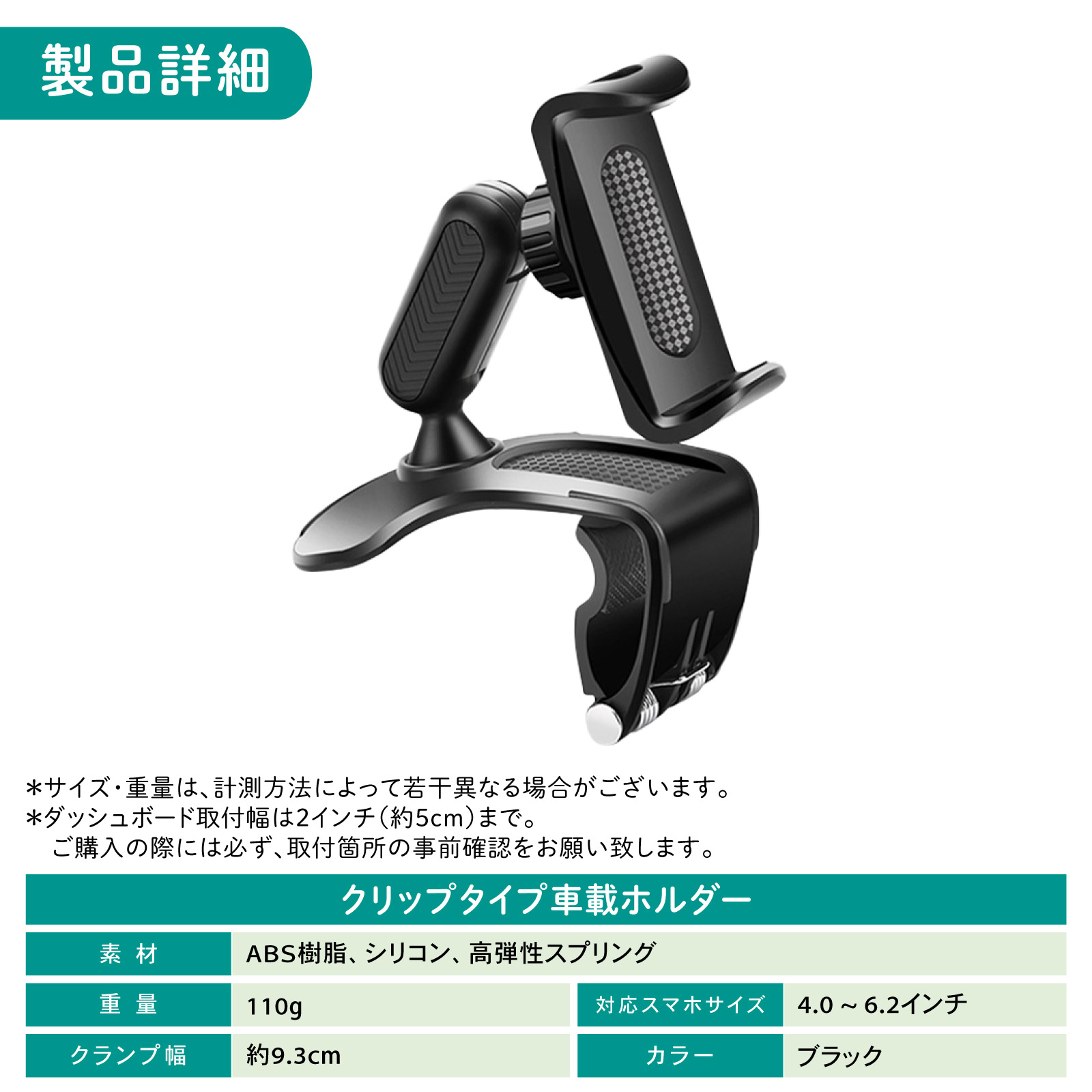 | 製品詳細 | ・商品名:クリップタイプ車載ホルダー ・素材:ABS樹脂、シリコン、高弾性スプリング ・重量:110g ・対応スマホサイズ:4.0〜6.2インチ ・クランプ幅:約9.3cm ・カラー:ブラック 注1:ダッシュボード取付幅は2インチ(約5cm)までです。事前に 取付箇所ご確認の上、ご購入の方お願い致します。 注2:サイズ・重量は、計測方法によって若干異なる場合がございます。 |