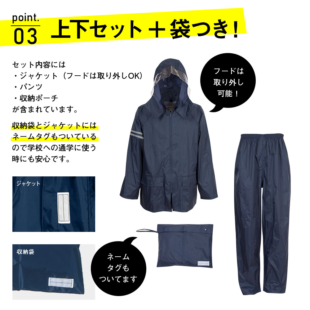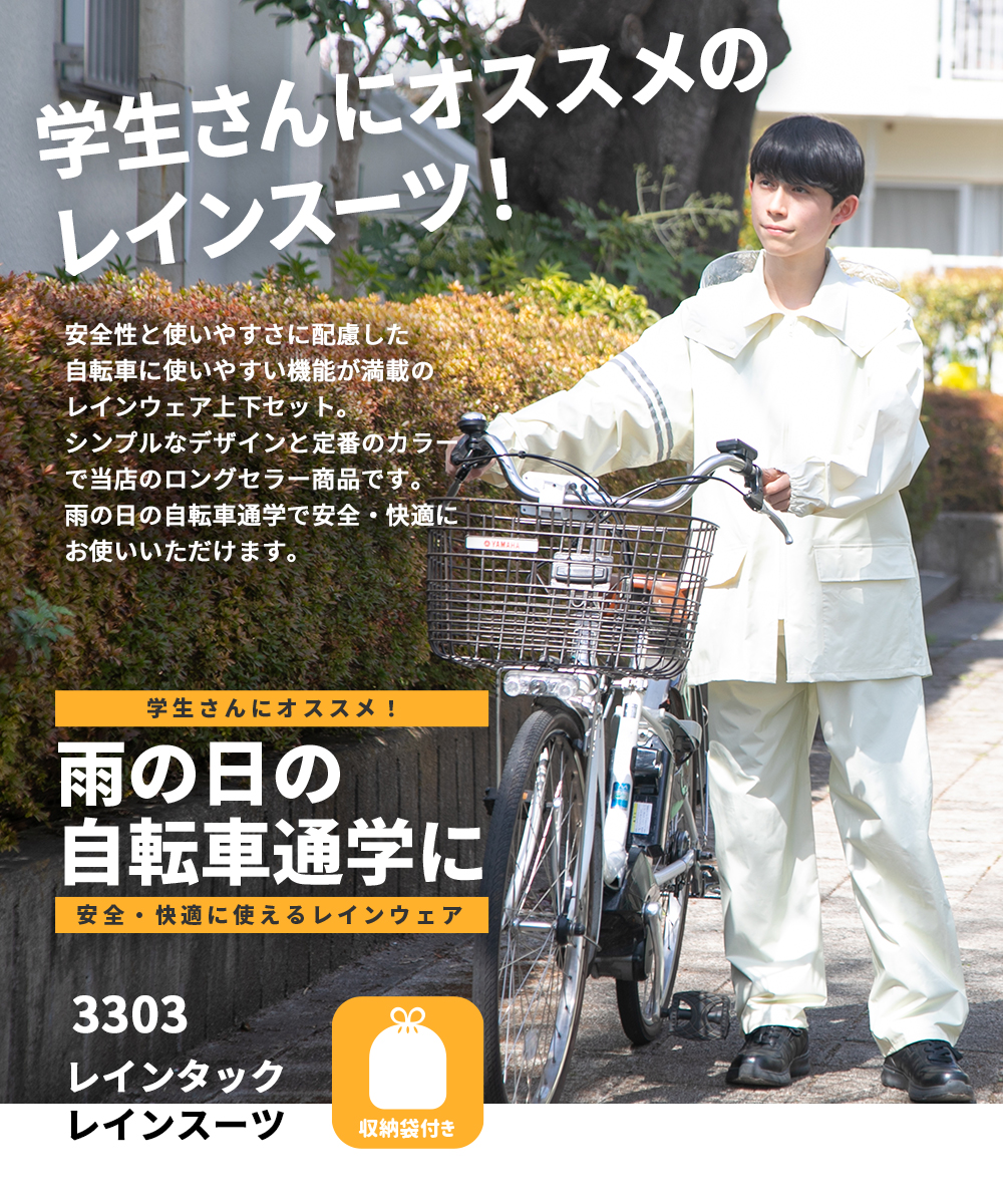 昔から変わらないシンプルなデザインと定番カラーが使いやすい、自転車通学に便利な機能を盛り込んだレインスーツ上下セットです。学校指定にオススメのデザインで、完全防水・撥水素材など必要機能を備えたベーシックな雨具は学生さんの自転車通学に最適です。