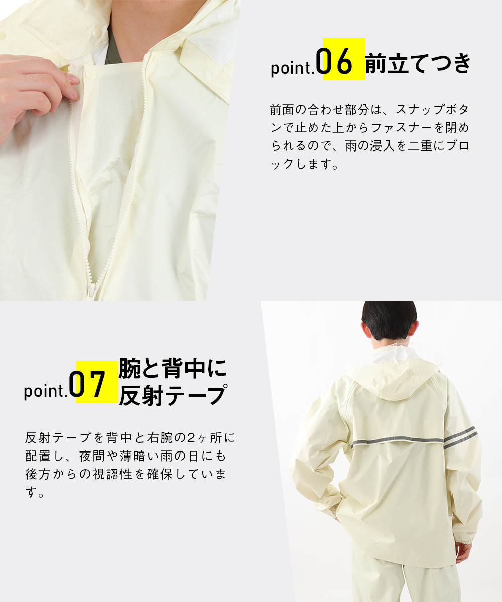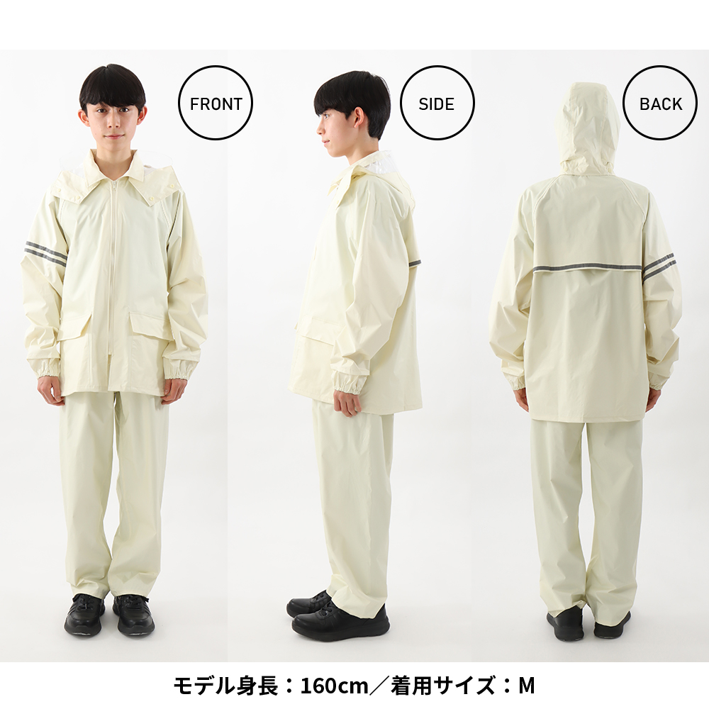 | 商品説明 | 学校指定のような落ち着いたデザインのレインスーツです。オシャレなレインウエアはスポーツ用品店などに行けばたくさん並んでいますが、学生さんの定番レインウエアって実店舗で売っているのをあんまり見かけませんよね。そういう事情もあってか、結構ネットで探されている方は多いんです。自転車通学の方は雨が降ってしまうと傘差し運転は出来ないので、レインウエアは必須アイテムですよね。このシリーズは当店でも1、2を争う超ロングセラー商品です。シンプルなデザインでも安全性と防水性は折り紙つき。フードは被った時の視界を妨げないよう、前方部分はクリア素材で作ってあります。取り外し可能なのでヘルメットをかぶった時は、ジャケットだけでも使用できますよ。袖口は二重になっていて、自転車のハンドルを持った手元に前からふき付ける雨の浸入を防いでくれます。前合せの部分はファスナーの下にもう1枚生地があり、スナップボタンで止めて雨の浸入をブロック。さらに夜間の視認性を向上させるため、背中と右袖に反射テープを付けました。総裏メッシュではありませんが、背中にベンチレーションを付けることで、ムレを緩和してくれます。収納用にレインウエアと同色の袋も付属していて、袋とジャケットには記名できるネームタグを付けました。中高生で自転車通学をされている方に便利な機能が揃っていますよ。カラーは通学でも違和感のないアイボリーとネイビーの二色をご用意しました。時代は変わっても、自転車通学に求められる基本的性能には大きな変化はありません。だからずっとずっと昔からの定番なのかもしれませんね。 |