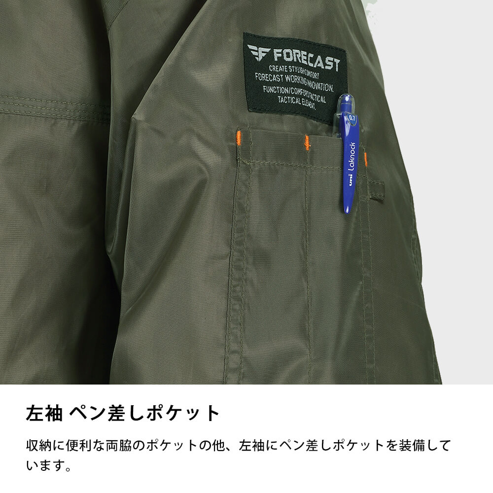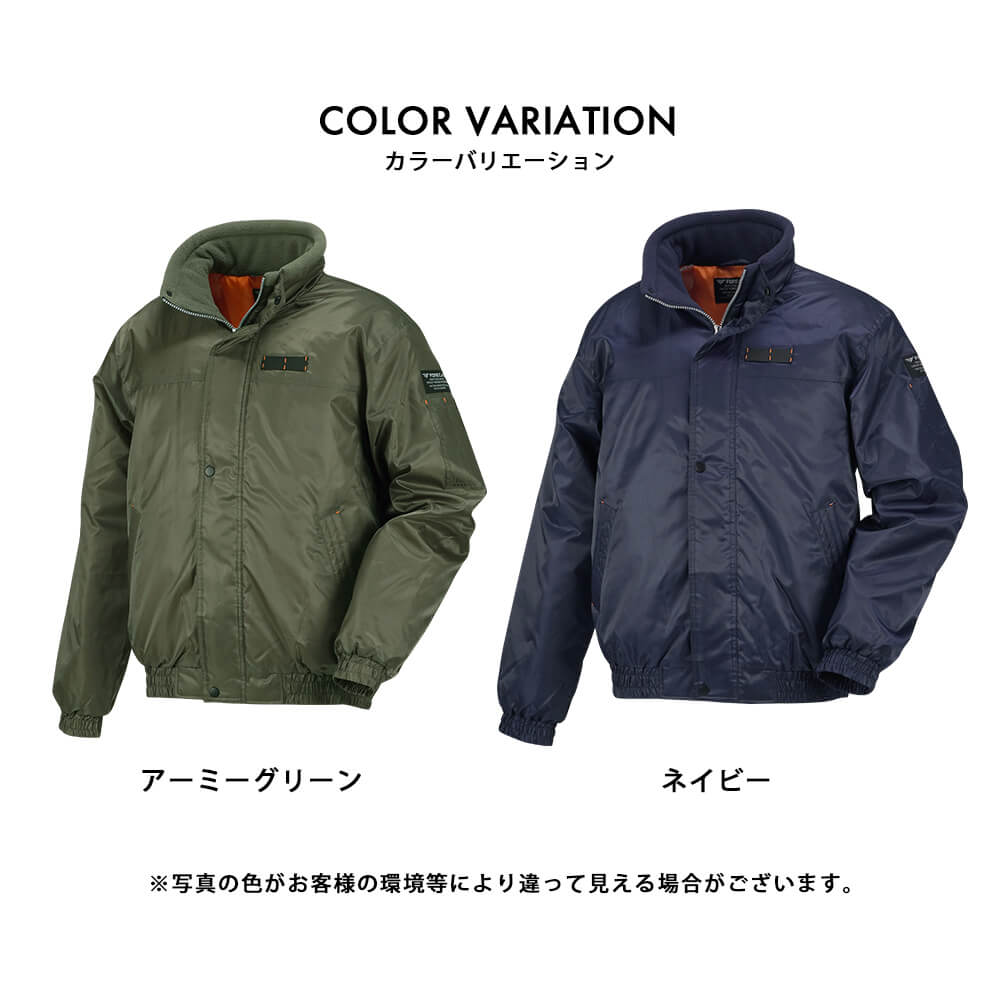 中わたが入ってあったかい着心地のメンズ防寒ジャンパー。MA-1のようなミリタリーテイストのブルゾンタイプで、作業着にもカジュアルなアウターとして普段着にも。マチ付きのポケットと内ポケットで収納力もバッチリ。フード無しで襟の内側はフリースで暖かく、ファスナーを上まで閉めれば冷たい風もしのげます。軽さと温かさからリピーターの方も多く、軽くて動きやすいので、冬のウォーキングなどにもオススメです。別売りのウィンターソルジャーパンツと上下セットアップが可能。
