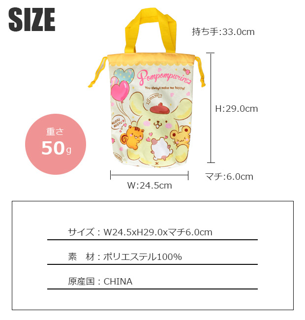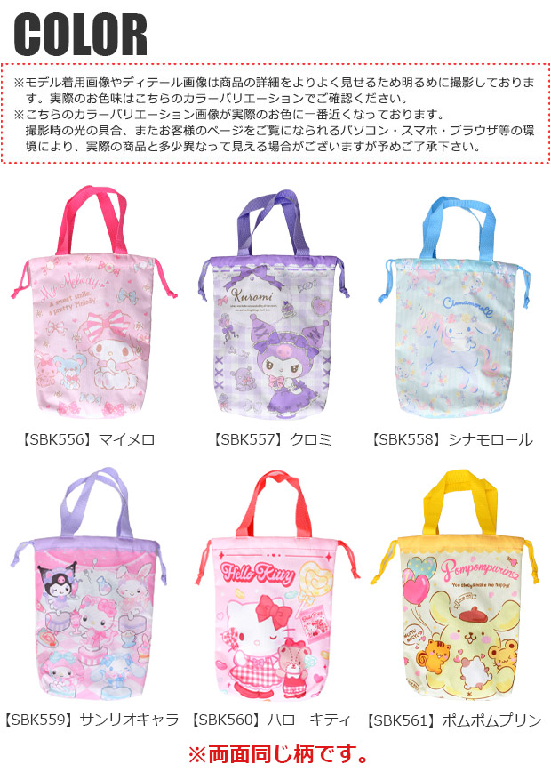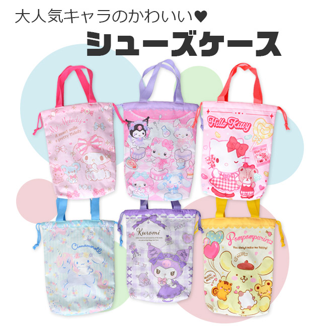 ハローキティ、マイメロディ、クロミ、シナモロール、ポムポムプリンなど人気キャラクターがデザインされた、子どもに大人気のシューズバッグです。
