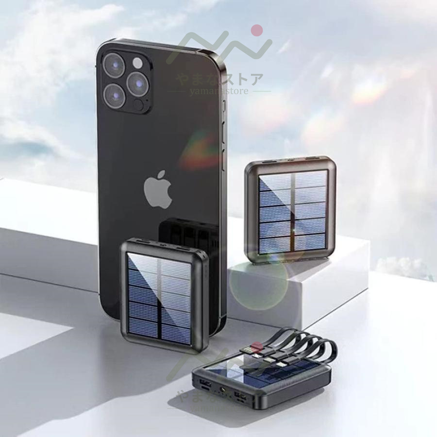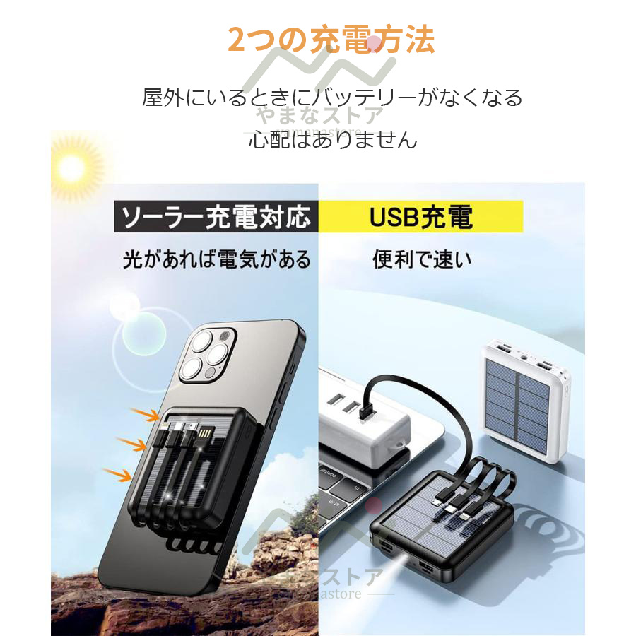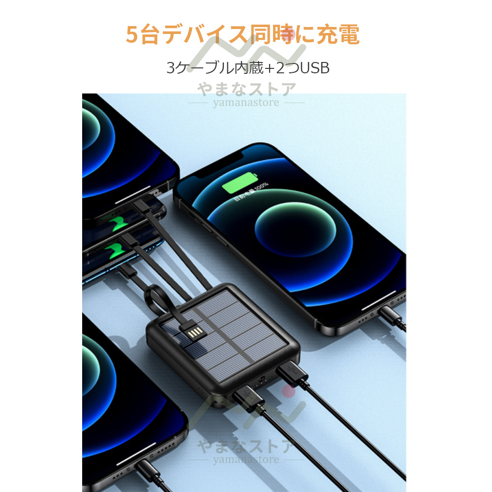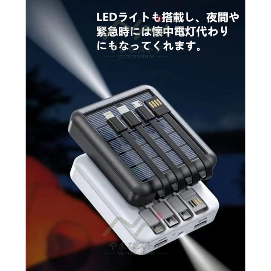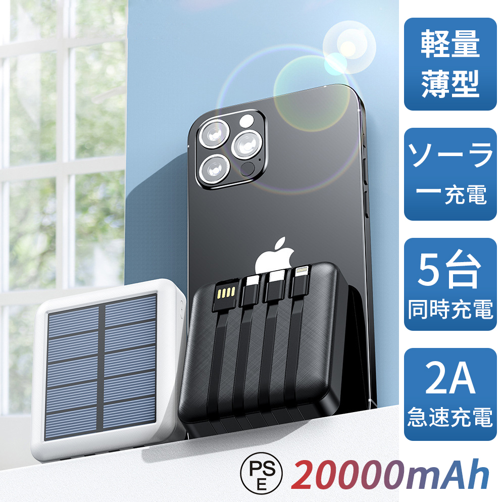 モバイルバッテリー 20000mAh 大容量 軽量 小型 10000mAh 薄型 ソーラー充電 5台同時充電 ケーブル内蔵 iPhone/iPad/Android対応 急速充電 PSE認証済