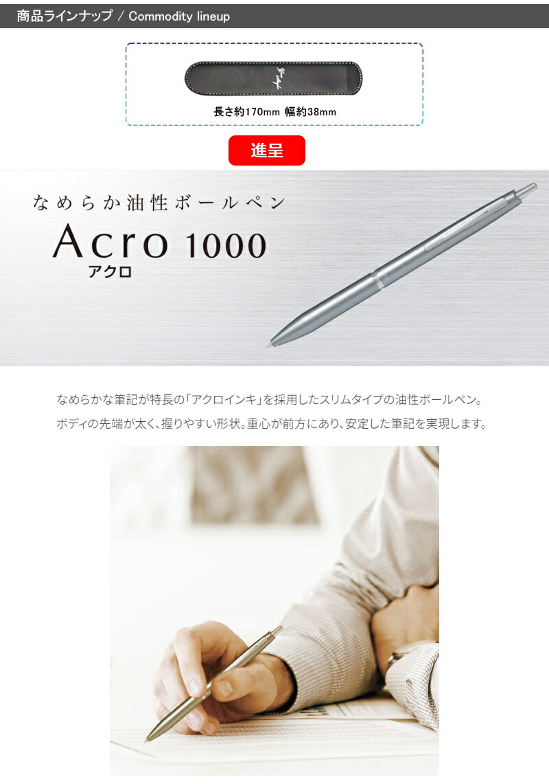 パイロット "アクロ1000" は、ノックタイプのオイルベースのボールペンで、低粘度油性インク「アクロインク」を使用し、滑らかな書き心地と滑らかな書き心地が特徴です。