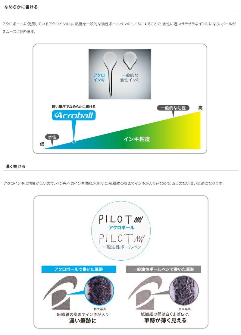 パイロットのアクロボールペンのユニークな低粘度ハイブリッドインクは、ゲルインクの鮮やかさと従来のボールペンインクの速乾性と耐水性を備えています。
