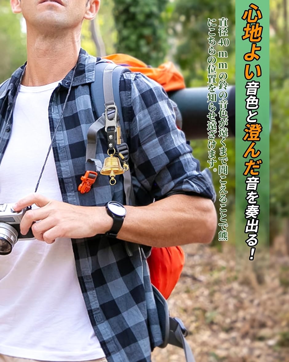 「熊よけ鈴で、自由にアウトドアを楽しみましょう。」クマよけ鈴はアウトドアでキャンプやハイキングなど、山岳地帯や森林地帯など、熊の生息地域に訪れる際に、農地や果樹園など場合にオススメ。