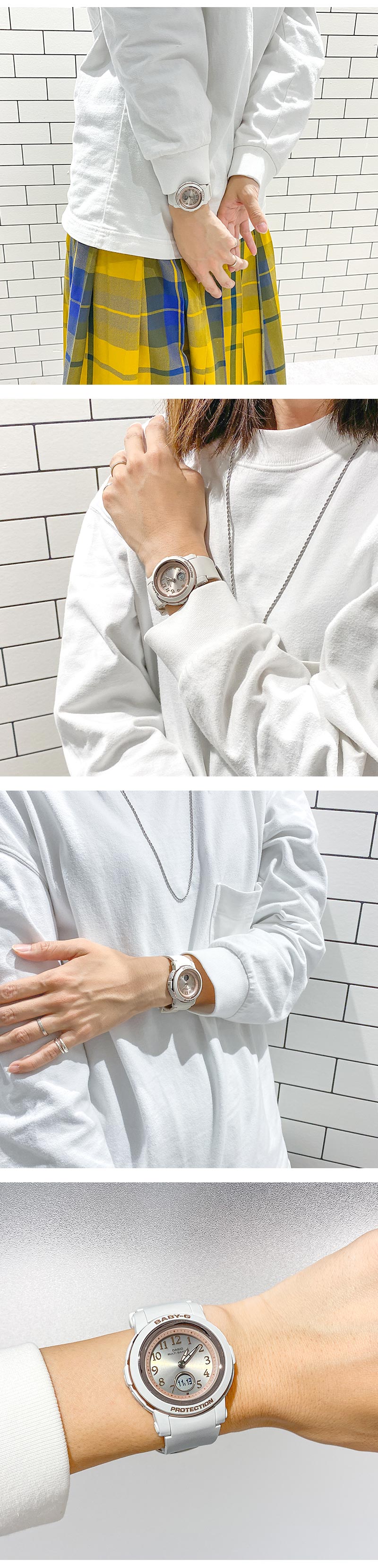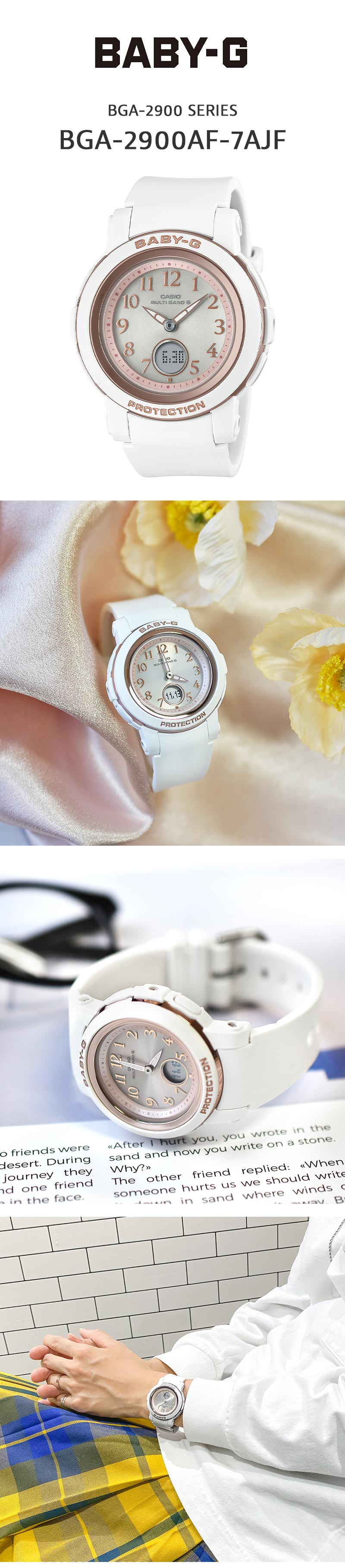 アクティブな女性のためのカジュアルウオッチBABY-Gから、ベーシックスタイルと相性の良いコンパクトな電波ソーラーモデルです。BGA-2900AFは、スリムなデザインが特徴であり、時刻を確認しやすいアラビックインデックスを施したダイアルデザインを採用しています。カラーにはどんな服装にも合わせやすい、ブラック、スモーキーピンク、ホワイトをラインアップ。機能面では、耐衝撃構造や10気圧防水、世界6局の電波を受信し時刻を自動修正するマルチバンド6、ワールドタイム、タフソーラー等、頼れる機能を備えています。アクティブシーンで役立つ機能はそのままに、オンタイムからオフタイムまで活躍するウオッチです。 BGA2900AF7AJF