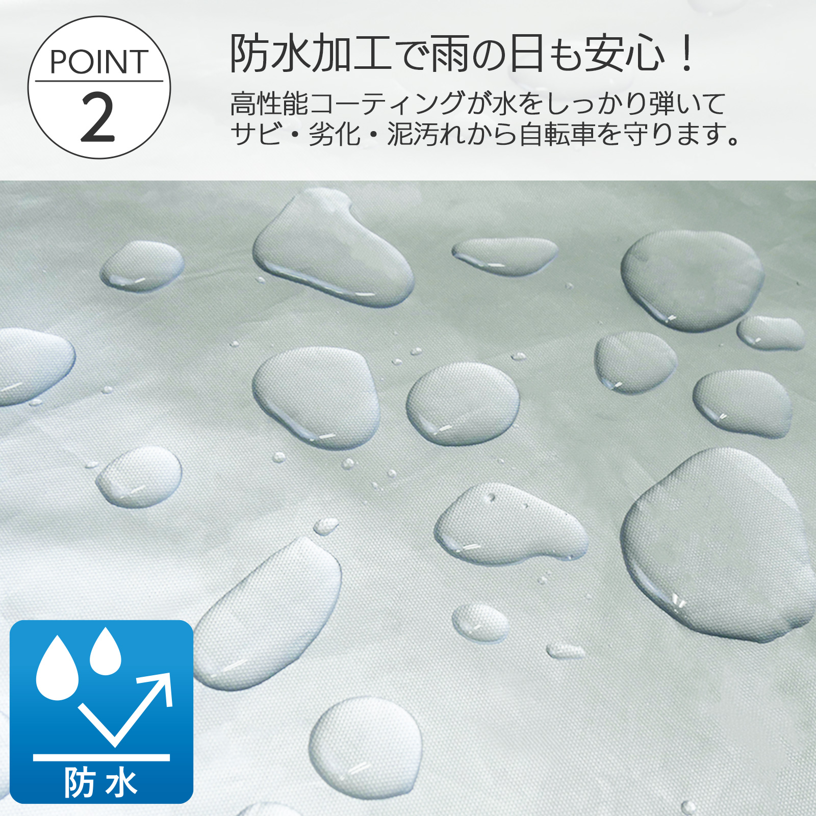 防水コーティングで雨水を弾き、サビや泥汚れから自転車を保護します。