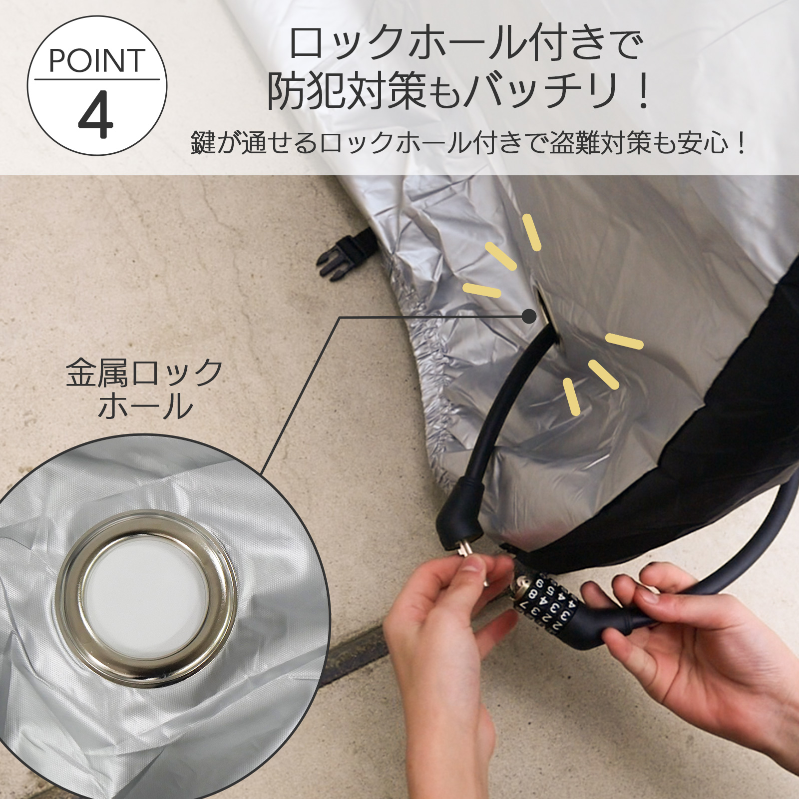 前輪部分に鍵を通せるロックホール付きで、カバーをかけたまま施錠可能。