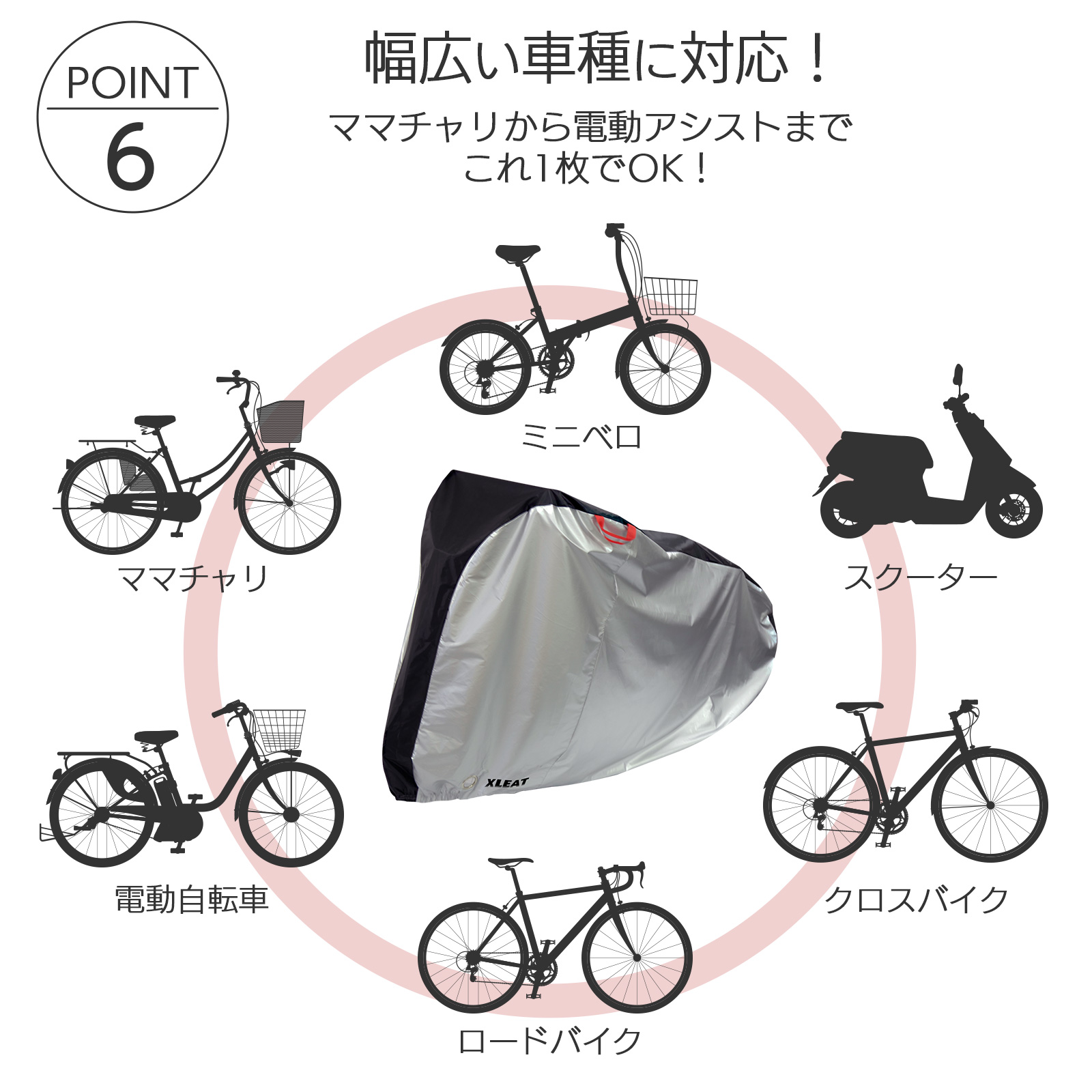 クロスバイク、ロードバイク、電動自転車、ママチャリ、ミニベロ、スクーターなどに対応。