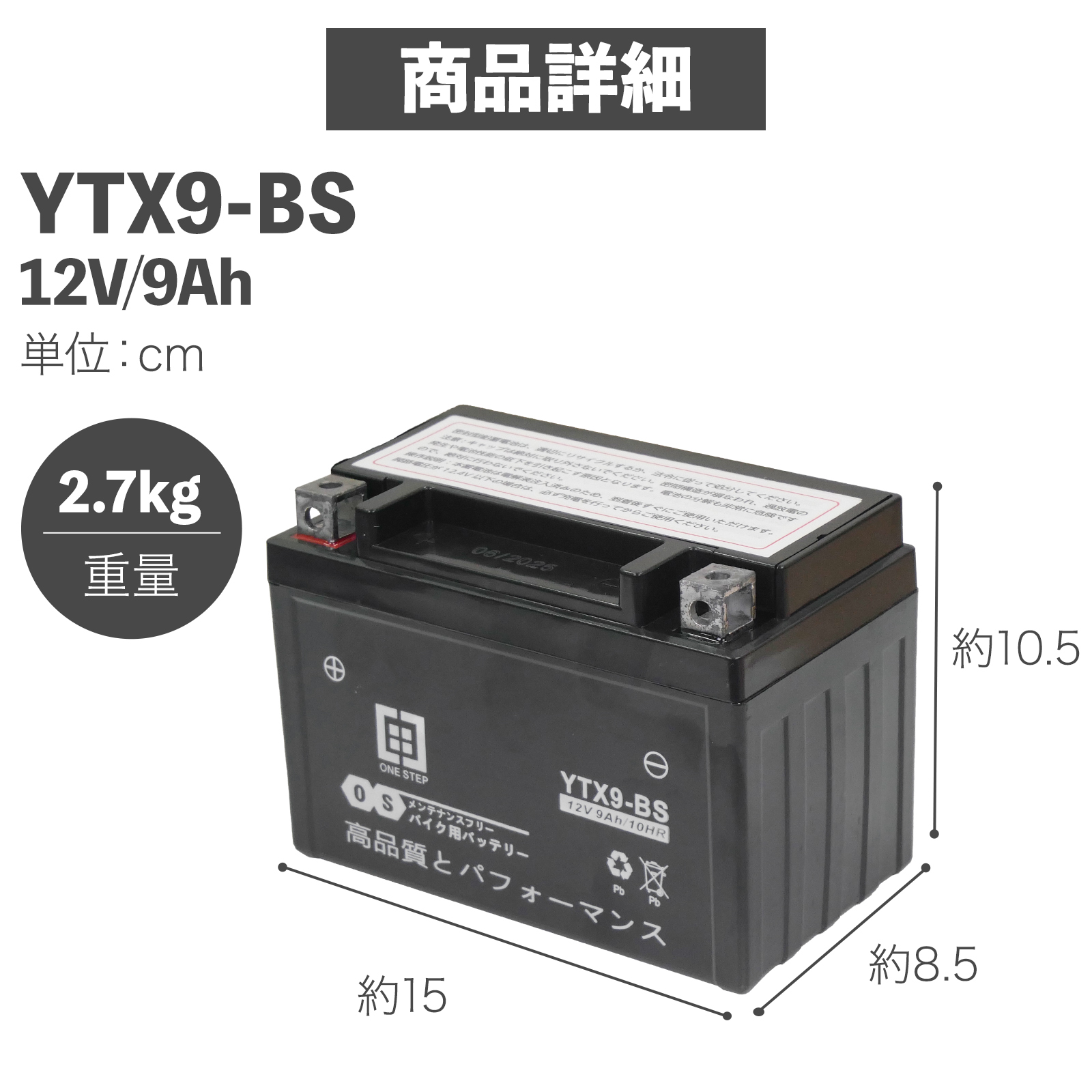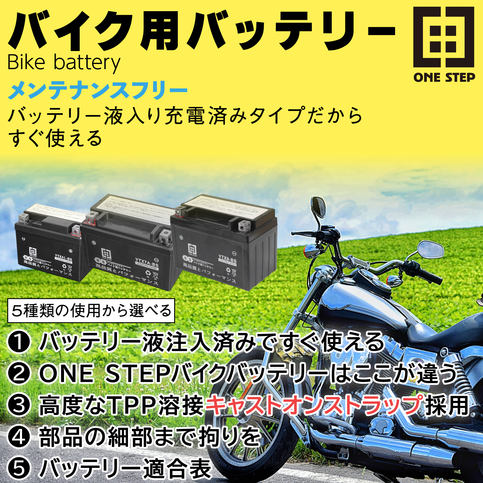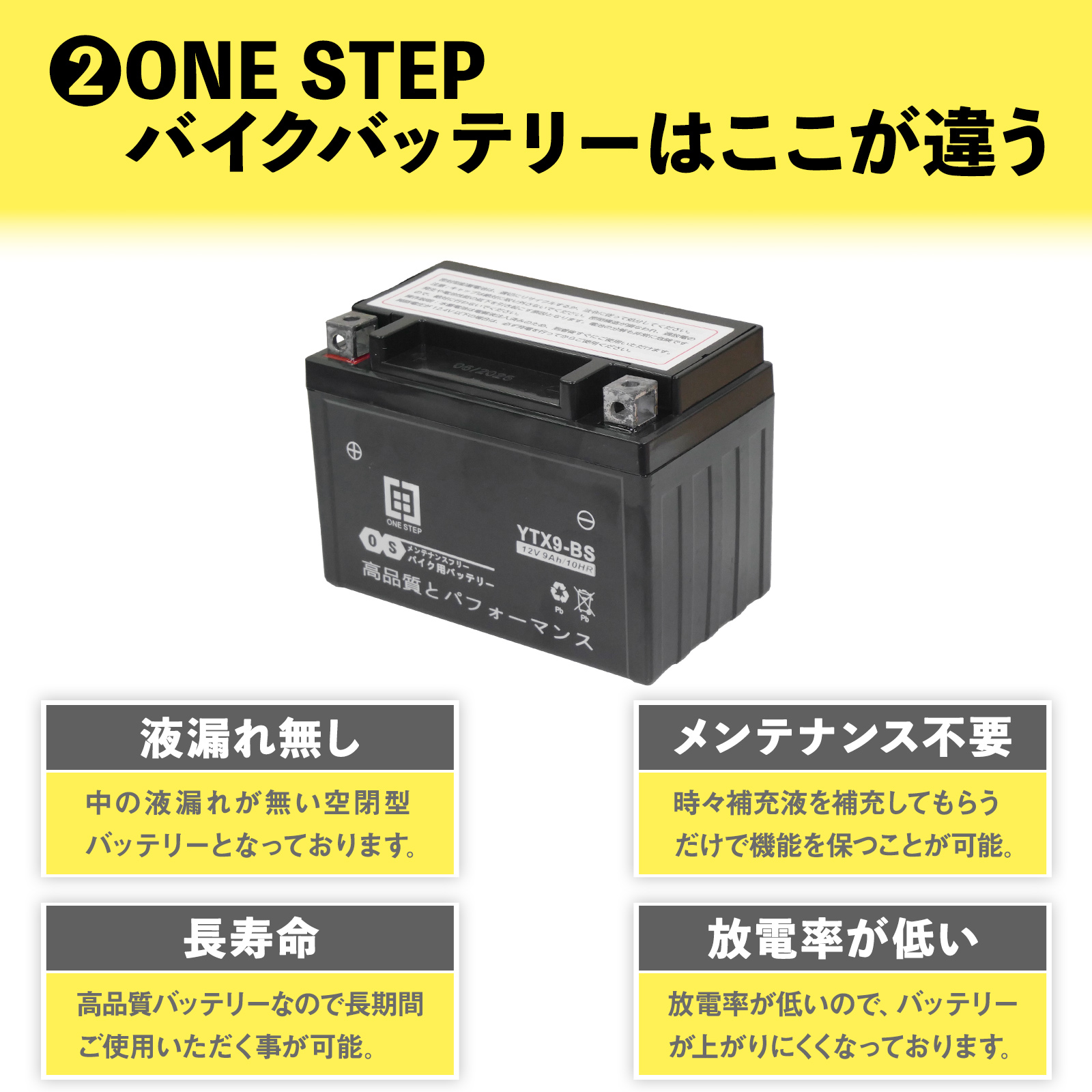 バイク バッテリー 充電器 充電 バイク用 バッテリー 9.0Ah 液入済み 充電済み ONE STEP