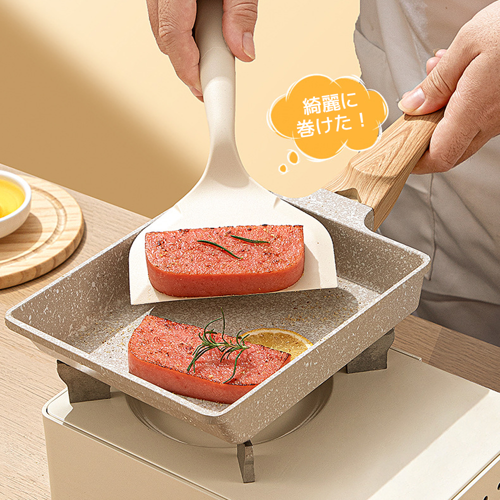 幅広ヘラが卵焼き器にぴったりフィットし、巻きやすく美しい仕上がりに。