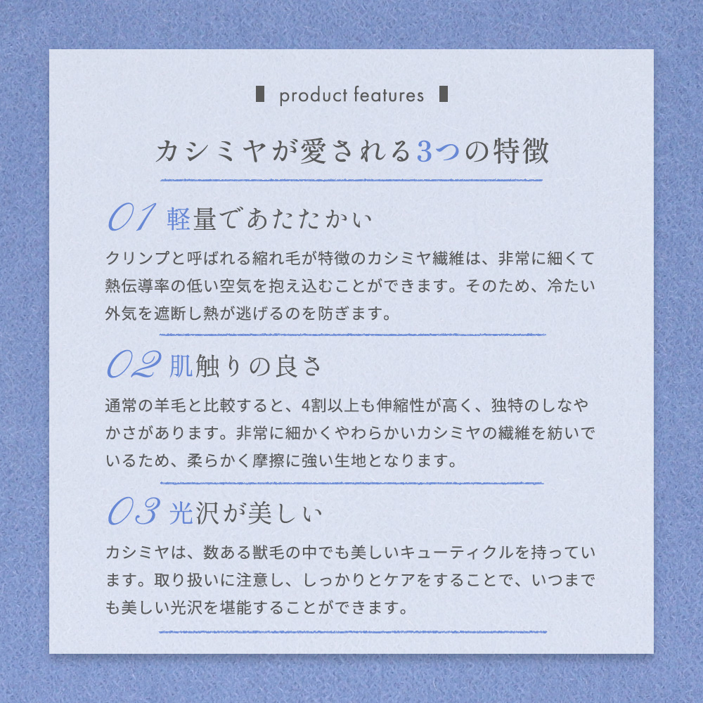 『繊維の宝石』と呼ばれるカシミヤは、保温力に優れており、とても温かな素材です。