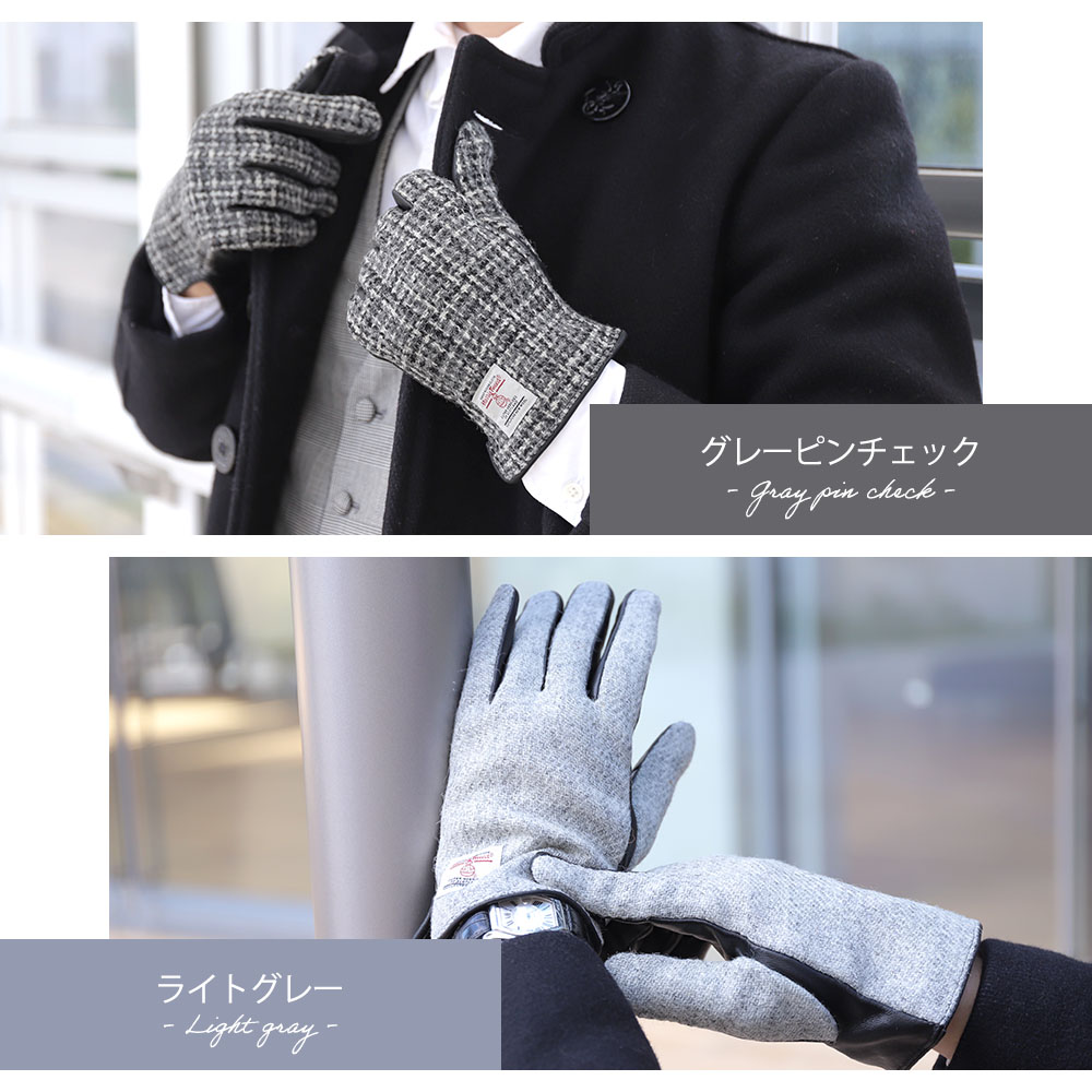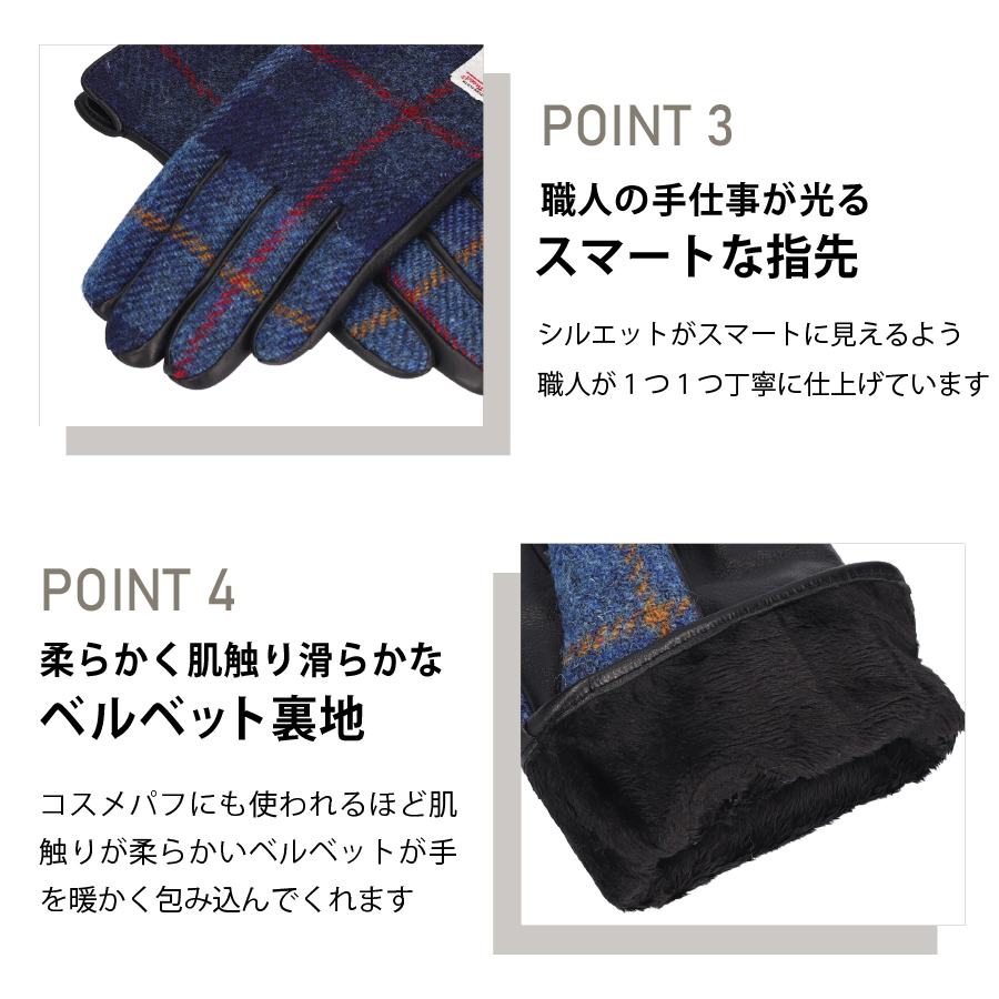 英国の伝統素材であるハリスツイードと、羊革の中でも一番柔らかくて上質なラムスキンを使用したレザーグローブです。両手の甲部分に取り付けられたオーブマーク付きのラベルは、手甲のハリス生地は本物のHarris Tweedの証。上質な素材と技術により、外観だけなく、肌触り、温かさも抜群の逸品です。レザーとツイード素材のコントラストの効いたデザインが手指を美しく見せてくれます。裏側全体には、毛足が長いベルベットを採用。ベルベットは、コスメパフにも使われるくらい肌触りがとても柔らかく、手を温かく包み込んでくれます。タッチパネル操作が出来る様、革全体に加工を施しているので、寒い中でのスマホ操作、駅での券売機やATM操作時に手袋を外す必要がなく、利便性もあります。生産拠点の工場は、ヨーロッパのファッションシーンにもアイテムを提供しているので、手のラインを美しく魅せる技術、しっかりとした縫製に長けています。