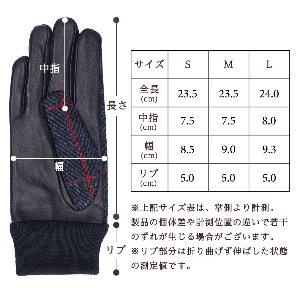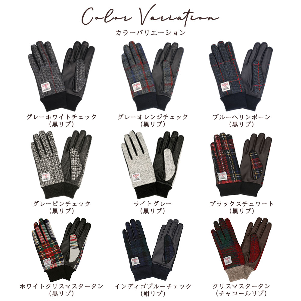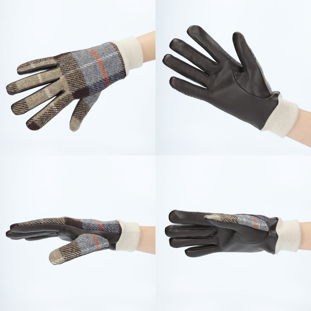 英国の伝統素材であるハリスツイードと、羊革の中でも一番柔らかくて上質なラムスキンを使用したレザーグローブです。両手の甲部分に取り付けられたラベルは、手甲のハリス生地は本物のHarris Tweedの証。上質な素材と技術により、外観だけなく、肌触り、温かさも抜群の逸品です。レザーとツイード素材のコントラストの効いたデザインが手指を美しく見せてくれます。裏側全体には、毛足が長いベルベットを採用。ベルベットは、コスメパフにも使われるくらい肌触りがとても柔らかく、手を温かく包み込んでくれます。タッチパネル操作が出来る様、革全体に加工を施しているので、寒い中でのスマホ操作、駅での券売機やATM操作時に手袋を外す必要がなく、利便性もあります。生産拠点の工場は、ヨーロッパのファッションシーンにもアイテムを提供しているので、手のラインを美しく魅せる技術、しっかりとした縫製に長けています。