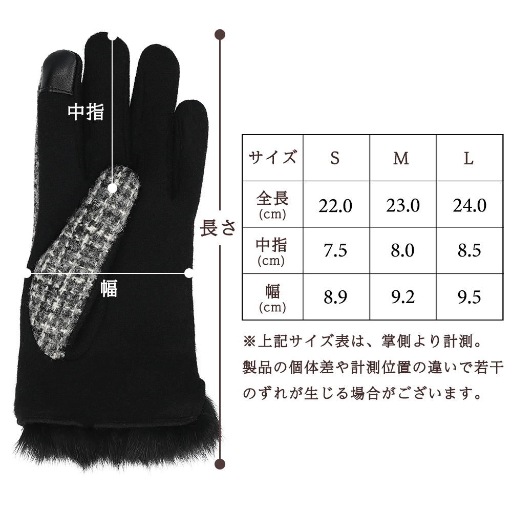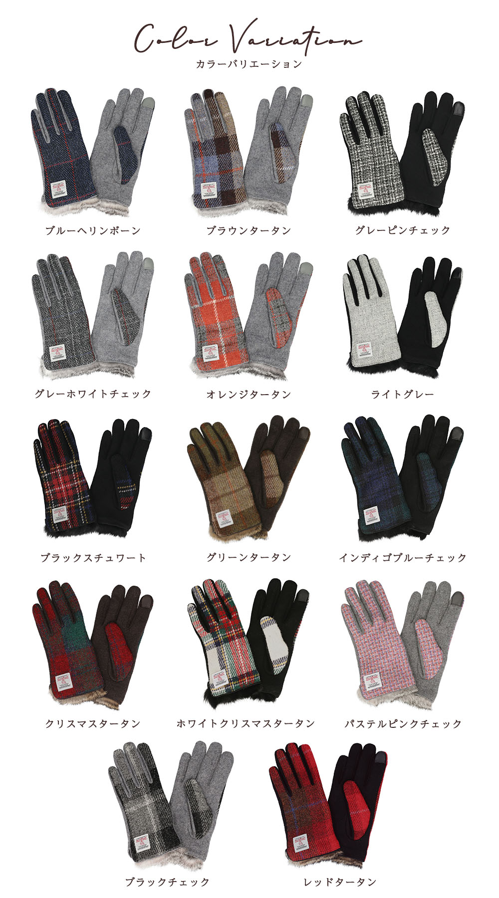 英国の伝統素材であるハリスツイード生地を使用した手袋です。両手の甲部分に取り付けられたオーブマーク付きのラベルは、手甲のハリス生地は本物のHarris Tweedの証。上質な素材と技術により、外観だけなく、肌触り、温かさも抜群の逸品です。裏側には、ファッションのアクセントにもなるラビットファーと毛足が長いベルベットを採用。ポリエステルベルベットは、コスメパフにも使われるくらい肌触りがとても柔らかく、手を温かく包み込んでくれます。タッチパネル操作が出来るように加工を施しているので、寒い中でのスマホ操作、駅での券売機やATM操作時に手袋を外す必要がなく、利便性もあります。生産拠点の工場は、ヨーロッパのファッションシーンにもアイテムを提供しているので、手のラインを美しく魅せる技術、しっかりとした縫製に長けています。