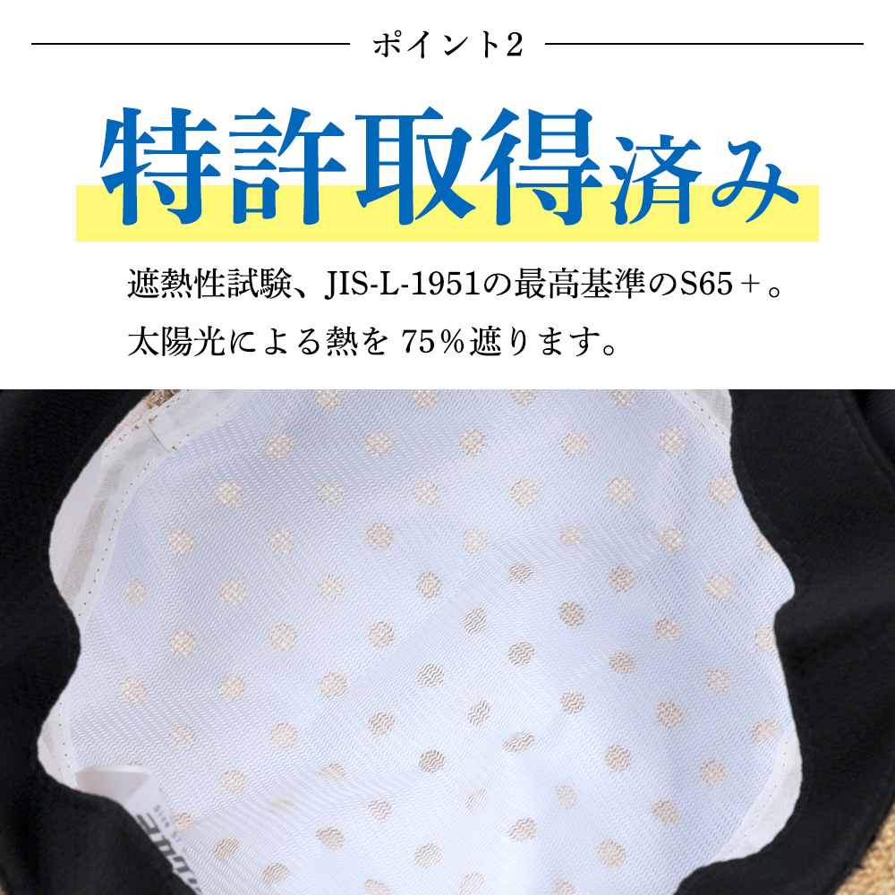 帽子メーカーが本気で考えた!地球温暖化による肌を刺すような猛烈な直射日光から頭とお肌を守る、インスタでも話題の、木陰のような涼しさ『コカゲル』ハットシリーズです!安心、安全の特許取得済みです(特許第 6840417号)。名前の由来〈木陰にいるような涼しさ〉の通り、紫外線だけではなく太陽の熱も遮断するので、マイナス10℃の温度を体感していただけます。遮熱素材(コカゲル)を挟み込んだコカゲルハットは、UVカット率は100%(※つばのみ100%。製品全体は99.9%以上)。紫外線よりも肌奥に届きシワ・たるみの原因といわれている近赤外線も99.2%カットします。通気性もバツグンで夏場気になる頭のムレも軽減出来ます。洗濯機洗いもできるので、いつでも清潔にご使用頂きます。普段使いや、野外での熱中症対策にもおすすめな帽子です。