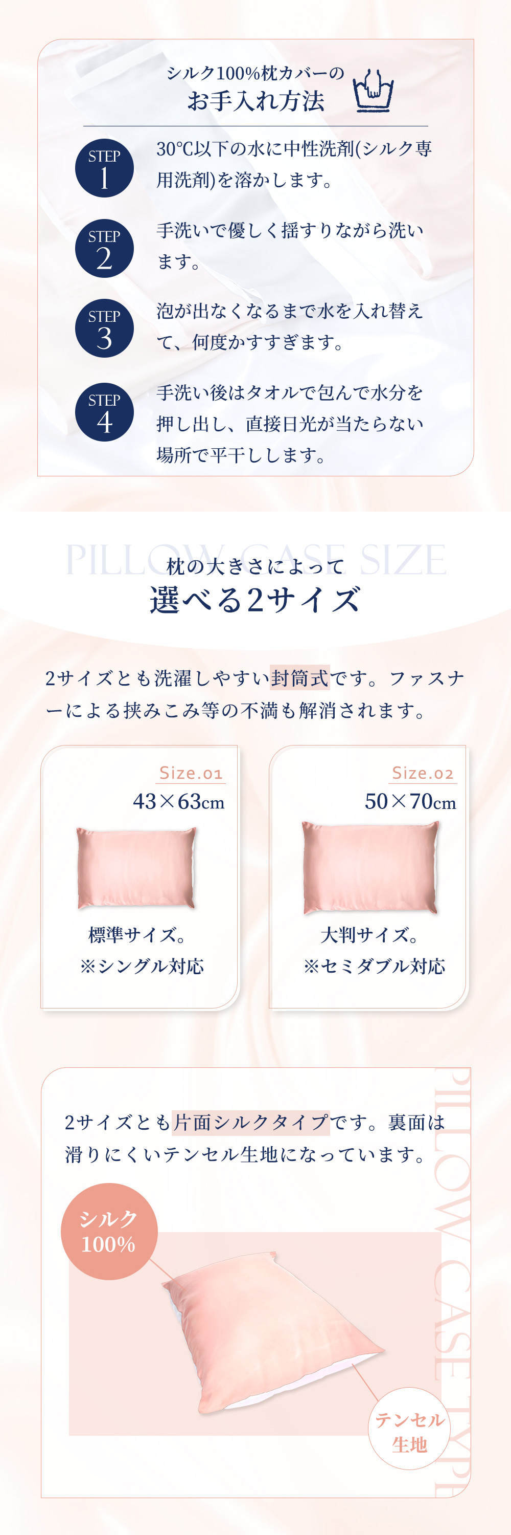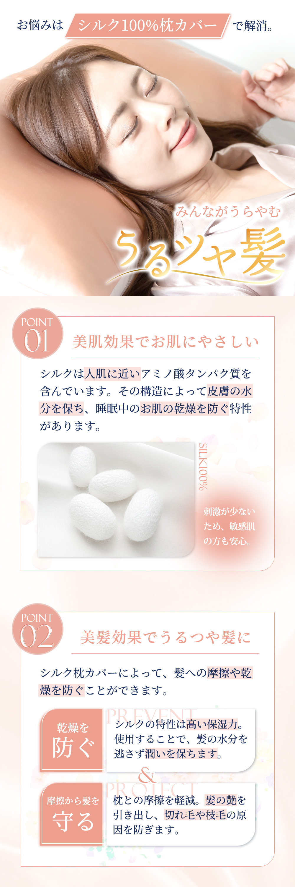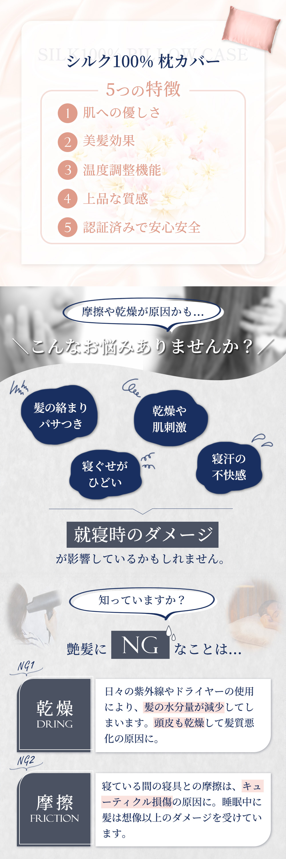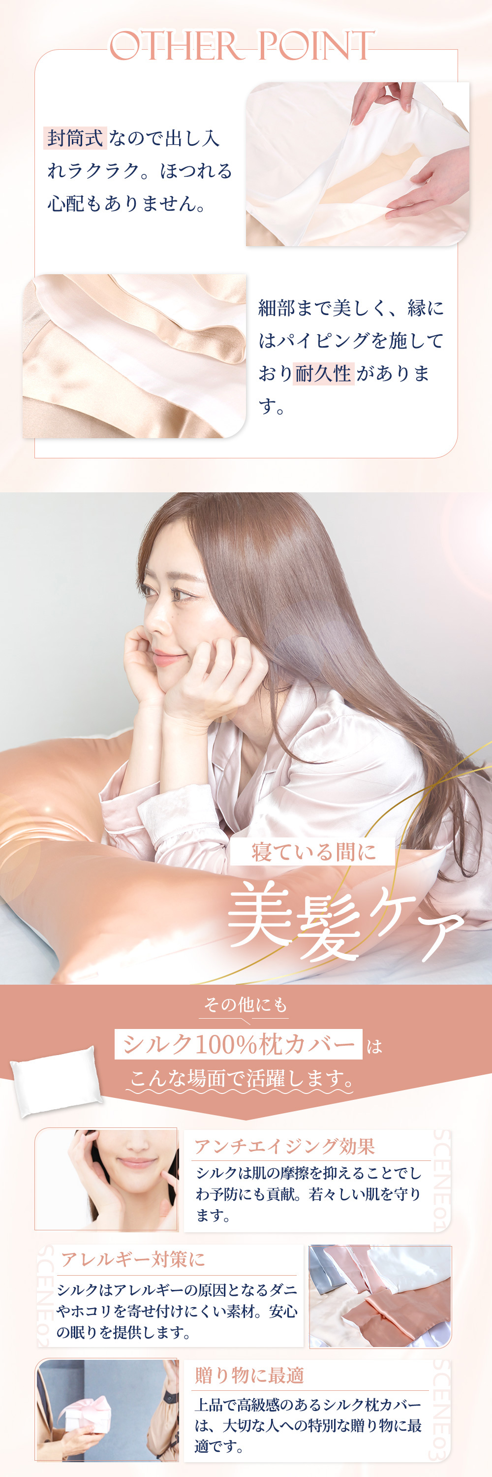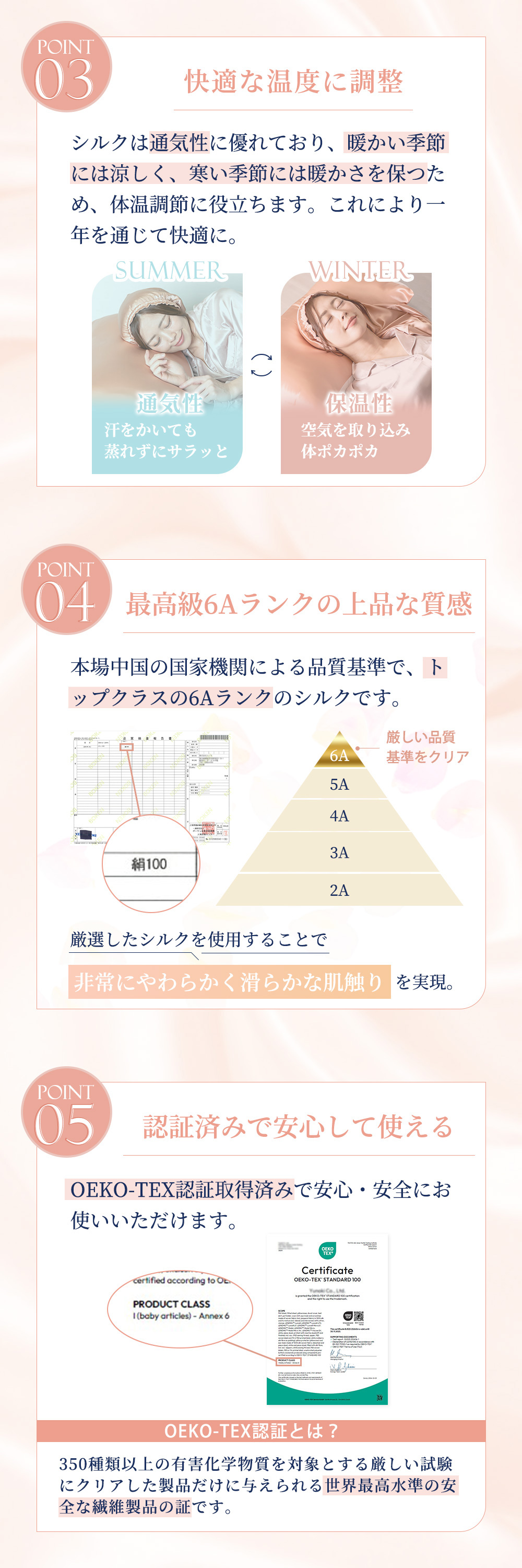 シルク100%枕カバー(utukky)の特長として、(1)美肌効果でお肌にやさしい…シルクは人肌に近いアミノ酸タンパク質を含んでいます。その構造によって皮膚の水分を保ち、睡眠中のお肌の乾燥を防ぐ特性があります。刺激が少ないため、敏感肌の方も安心です。(2)摩擦から髪を守る…枕との摩擦を軽減。髪の艶を引き出し、切れ毛や枝毛の原因を防ぎます。(3)乾燥を防ぐ…シルクの特性は高い保湿力。使用することで、髪の水分を逃さず潤いを保ちます。(4)6Aランクシルクを使用…中国の国家機関による品質基準で、トップクラスの6Aランクのシルクです。(5)快適な温度に調整…シルクは通気性に優れており、暖かい季節には涼しく、寒い季節には暖かさを保つため、体温調節に役立ちます。これにより一年を通じて快適に。(6)優れている耐久性…細部まで美しく、縁にはパイピングを施しており耐久性 があります。(7)OEKO-TEX認証取得済みで安心・安全…350種類以上の有害化学物質を対象とする厳しい試験にクリアした製品だけに与えられる世界最高水準の安全な繊維製品の証を取得しています。