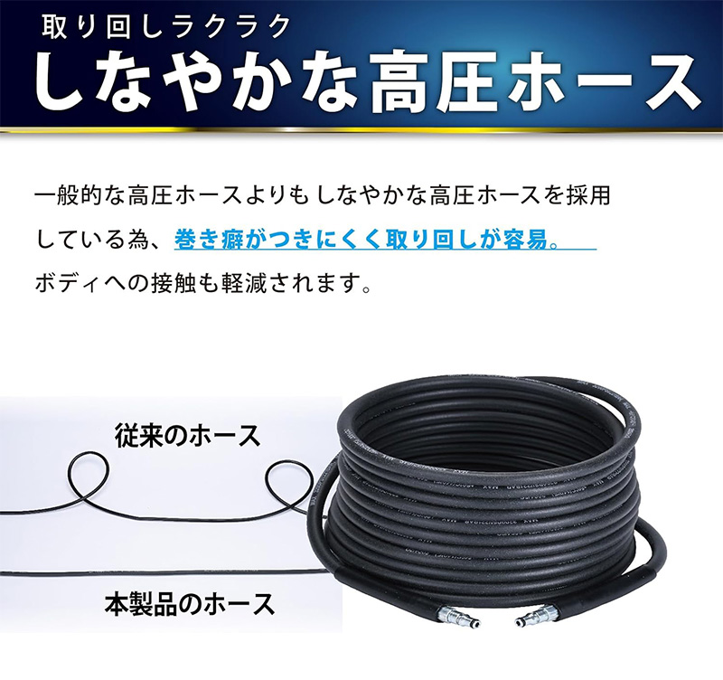 水形や角度を変えられる洗車に特化したノズルが付属した高圧洗浄機。静音設定で住宅街での使用も安心です。通常の高圧洗浄機として外壁やベランダ等の掃除にも使用いただけます。