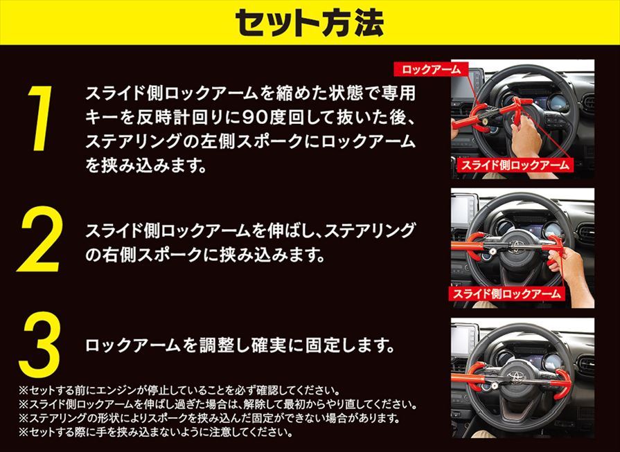 | 大切な車の車両盗難対策に!ダブルロック式のハンドルロックです。 | |