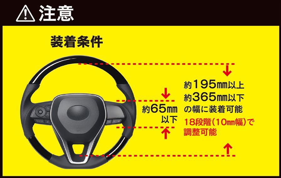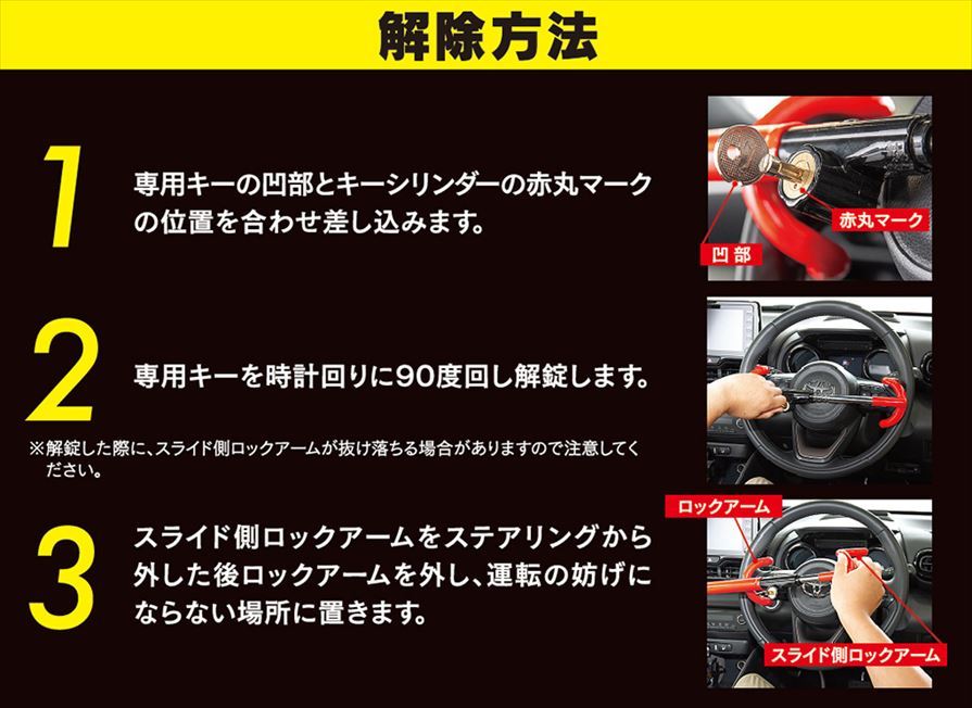 | 【ご購入の前にお読みください。】 ●装着条件を必ずご覧ください。 ●装着条件を満たしていても、バックルやステアリングの形状によっては、ご利用いただけない場合があります。 ●温度変化や装着時の引っ張り強度により、ステアリングに傷や凹みが生じる場合があります。 ●万一ステアリングまたはパネルなどに凹みや傷が発生しても責任を一切負いかねます。 ●本製品の使用によりステアリングに色移りなどが生じる場合がございます。長期間使用される場合は接触部分を保護してください。 ●本製品の動作有無に関わらず、万一車両盗難、車上ねらいなどが発生しても責任を一切負いかねます。 ●本製品の仕様およびデザインは性能向上等のため予告なく変更する場合がありますのであらかじめご了承ください。 【注意】 ●ステアリングに装着する前に、全ての可動部や専用キーが正常に動作することを確認してください。 ●本製品を装着した状態では絶対に運転しないでください。 ●エンジンが停止していることを確認の上、ご利用ください。 ●製品の性質上、専用キーの複製は行っておりません。紛失しないように大切に保管してください。 ●本製品装着の際に車両側に強い力が加わる場合は、装着位置や角度を調整してください。改善されない場合はご利用を中止してください。 ●エンジンが停止したことを確認の上、ご利用ください。エンジン停止後にステアリングが可動する車両は、可動停止後に本製品を装着してください。 ●本製品を使用しない時は、運転の妨げにならない安全な場所に保管してください。危険ですので運転席の足元やダッシュボードには絶対に置かないでください。 ●小さなお子様の手の届くところに本製品を置かないでください。けがや事故の原因になります。 ●キーシリンダーにゴミなどが入り込まないように注意して保管してください。 ●炎天下では、本製品が高温になっている場合があります。触れるとやけどする恐れがありますので注意してください。 ※画像はイメージです。実際の商品とは異なる場合がございます。 ※パッケージにつきましては、メーカーの仕様変更等により予告なく変更になる場合がございます。パッケージの違いによる返品・交換は承っておりませんので予めご了承ください。 | |