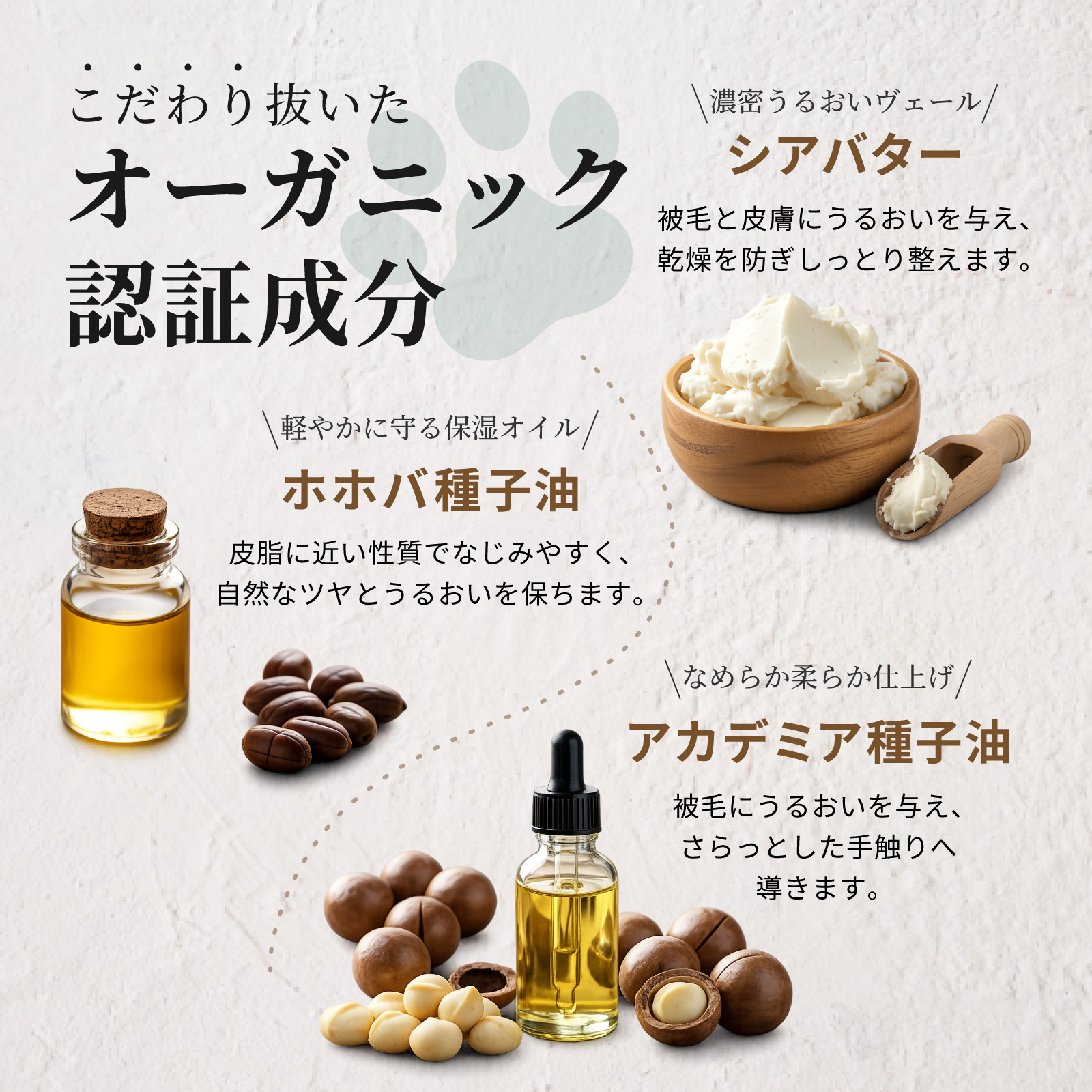 79%美容液成分+オーガニックシアバター配合の犬猫用オーガニックシャンプー。