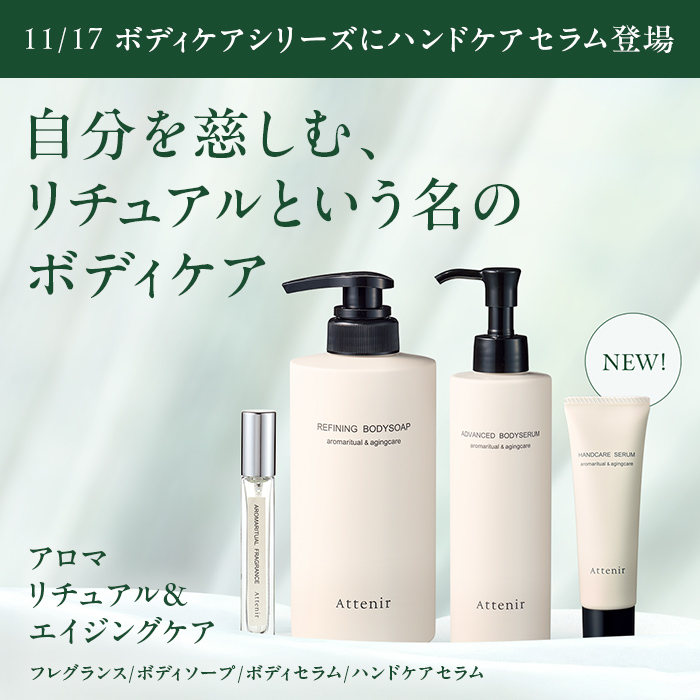 ※一部予告をしておりました『アロマリチュアル & エイジングケア』シリーズ 数量限定『セラムインハンドソープ 〈シトラスバーベナフォレスト〉』は、在庫の兼ね合いによりアテニア公式ショップ Yahoo!店での販売を見送ることとなりました。