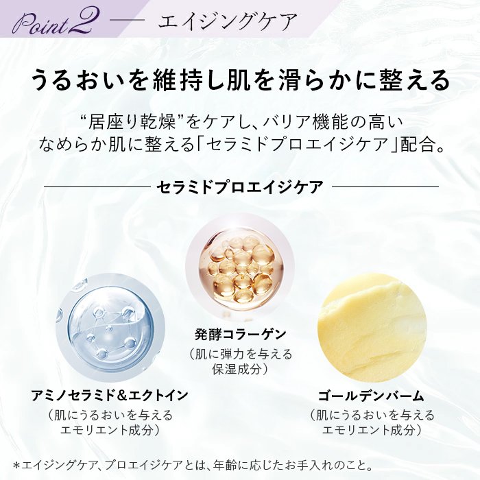 ●“居座り乾燥”をケアし、バリア機能の高いなめらか肌に整える「セラミドプロエイジケア」配合。