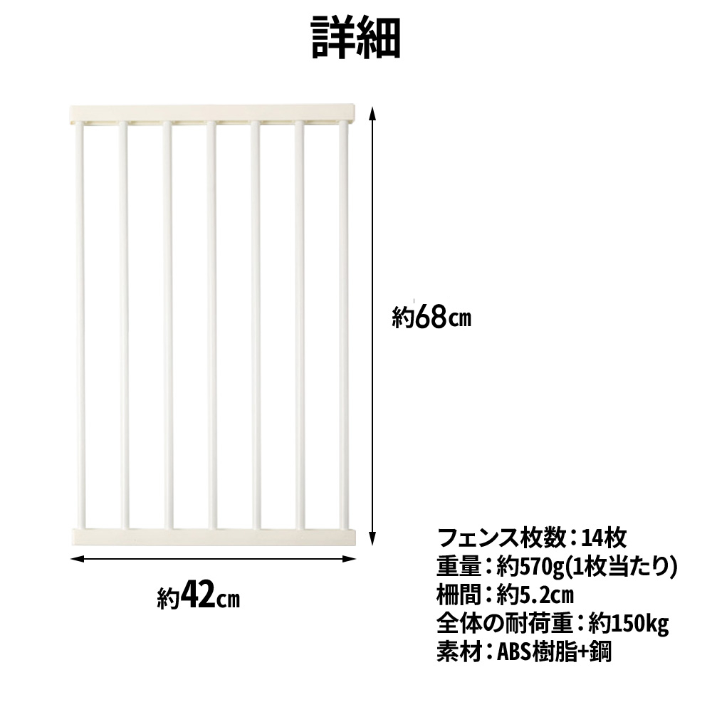 ペットサークル14面 ブラック ホワイト ・自由にレイアウト可能! 14枚のフェンスで大きなサークルが作れます。 真四角や長方形など、お部屋の大きさに合わせてお好みサイズに調節可能。 圧迫感のない柵のため、愛犬は安心して過ごすことが出来ます。 ・ドア付きで簡単開閉 上下ダブルロック機能で脱走防止対策もばっちりです。 付属のクリップで更にフェンスが開かないように強化可能。 段差もなく、出入りがしやすいです。 ・狭い柵間ですり抜け防止 柵間が狭く、間からすり抜ける心配はありません。 うさぎなどの小動物のサークルとしてもお使い頂けます。 ・腐食しない素材 長くお使い頂けるABS樹脂+鋼素材を使用。 衝撃に強く、強度の強いサークルです。 〔商品詳細〕 1枚あたり サイズ:幅42×高68cm 重量:約570g 最大 サイズ:幅173×奥行131cm×高68cm 重量:8kg 柵間:約5.2cm 全体の耐荷重:約150kg 素材:ABS樹脂+鋼 カラー:ホワイト、ブラック ※ドアは端のみに付けられます(真ん中には付けられません) |
