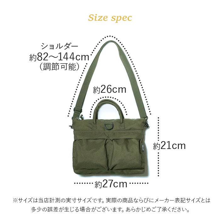 | [縦]約21cm/[横]約27cm/[マチ]約5.5cm [ショルダー]約82cm〜約144cm(調節可能) [持ち手]約26cm ※サイズは当店計測の実寸サイズです。実際の商品ならびにメーカー表記サイズとは多少の誤差が生じる場合がございます。あらかじめご了承ください。 |