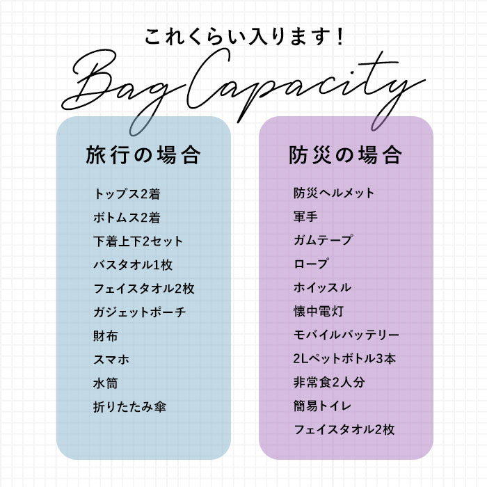 | ・タウンユースはもちろん!旅行や防災用など幅広く活躍◎収納力抜群な「デイパック」が新登場。 【どんなシーンでも安心のサイズ感】 ・たっぷりの深さがあり、着替えなどがしっかり収まる容量45Lサイズ!荷物の多いお出かけに最適。 【ガバっと開いて出し入れスムーズ】 ・メインルームは左右どちらからも、ラウンド型に大きくオープン。中身を確認しやすく、取り出しラクラク。 【A3サイズも2LペットボトルもIN】 ・A3サイズや2Lペットボトルが縦向きにすっぽり。アウトドアや登山、防災リュックとして!いざという時の備えも安心。 【小物をすっきり整理できて紛失防止】 ・外側には複数のポケットを配置。使用頻度の高い物をまとめたり、ドリンクボトルや折りたたみ傘もサッと出し入れ! 【負担をかけず背負い心地快適】 ・背面とショルダーベルトは程よいクッション性があり、体にかかる負担を軽減。 【チェストベルトでズレ落ちをガード】 ・肩への負担を抑えるチェストベルトを搭載。動きを妨げないよう、体にフィット。 【荷物の量に合わせて横マチを調節】 ・両サイドにはフィット感を調節できるベルト付き。フォルムもキープ。 【暗闇での視認性をアップ】 ・フロントには、暗闇でヘッドライトの光を反射するリフレクター付き。視界の悪い日も安心。 【ガシガシ使えて丈夫なデイパック】 ・水や汚れに強く、耐久性のあるポリエステル素材。気軽に使えて、現場仕事の方や職人さんにもおすすめ。 【シンプルなユニセックスデザイン】 ・性別や年代問わず持ちやすい仕上がり。色違いで揃えたり、家族でシェアも! 【ポケット仕様】 ・前面:面ファスナーポケット1、ファスナーポケット1 ・サイド:メッシュポケット×2 |