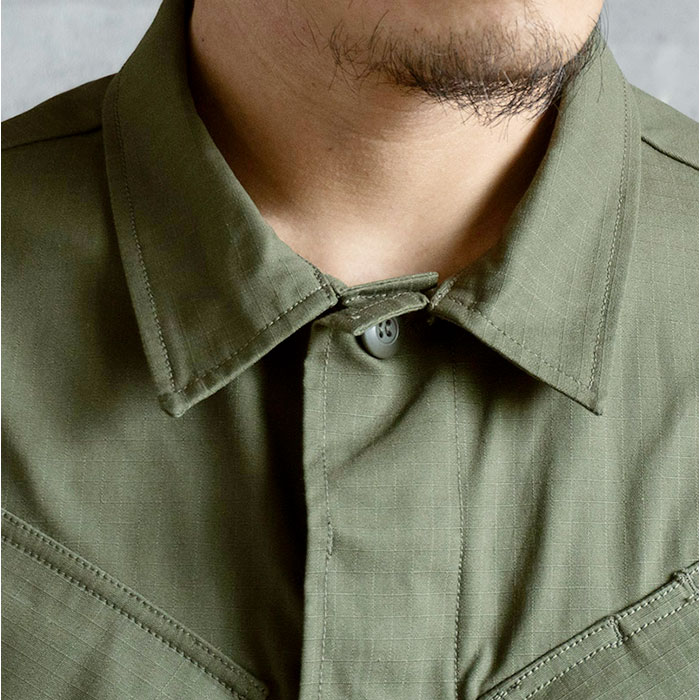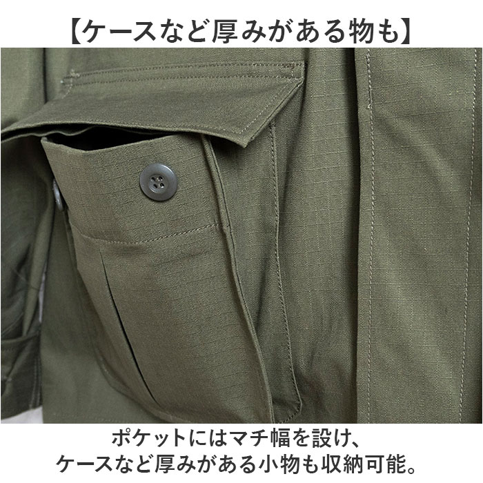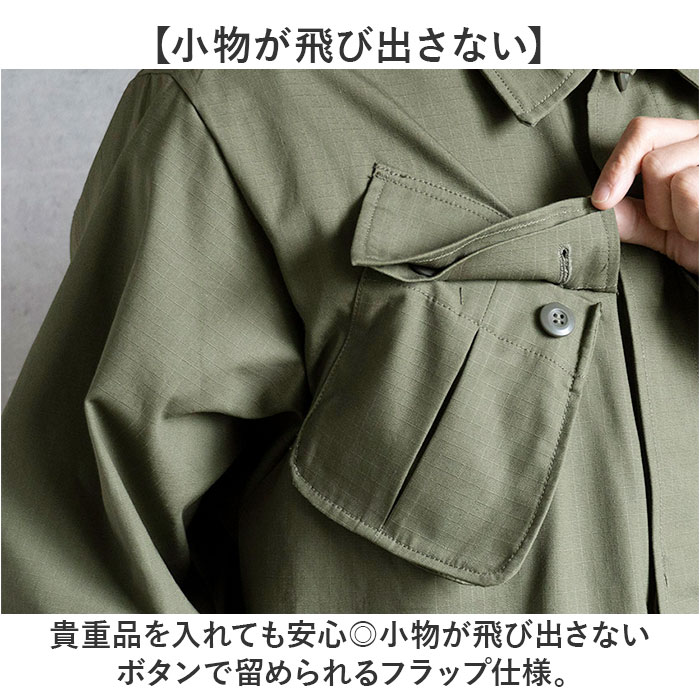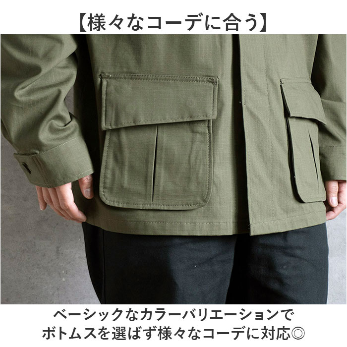 | 【最終モデルを忠実に再現】 ・ジャングルファティーグ4thモデルを素材や仕様、デザインまで忠実に再現したアイテム 【ジャングルファティーグ】 ・1962年に採用されたジャングルファティーグから完成度の高い最終モデルを採用。 【リップストップ生地】 ・破れにくいコットンポプリンのリップストップ生地を使用し、毎日使っても安心なタフ仕様 【実用性も兼ねた4ポケット】 ・フロントには4つのポケット付き。デザイン性はもちろん、実用性も兼ねた作り◎ 【ケースなど厚みがある物も】 ・ポケットにはマチ幅を設け、ケースなど厚みがある小物も収納可能。 【小物が飛び出さない】 ・貴重品を入れても安心◎小物が飛び出さないボタンで留められるフラップ仕様。 【シンプルなワンカラー】 ・年代問わず使えるシンプルなワンカラー。オフィスカジュアルにもオススメ♪ 【様々なコーデに合う】 ・ベーシックなカラーバリエーションでボトムスを選ばず様々なコーデに対応◎ 【ミリタリーが好きな方に】 ・本格的な作りでミリタリーが好きな方にもオススメなアイテム。 |