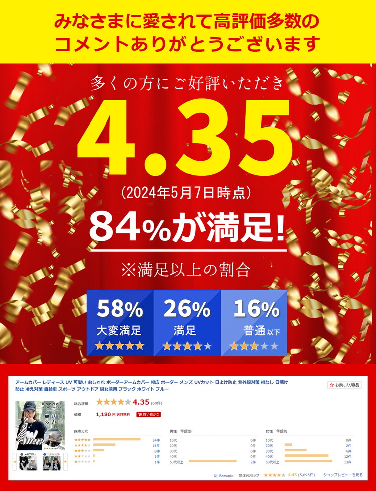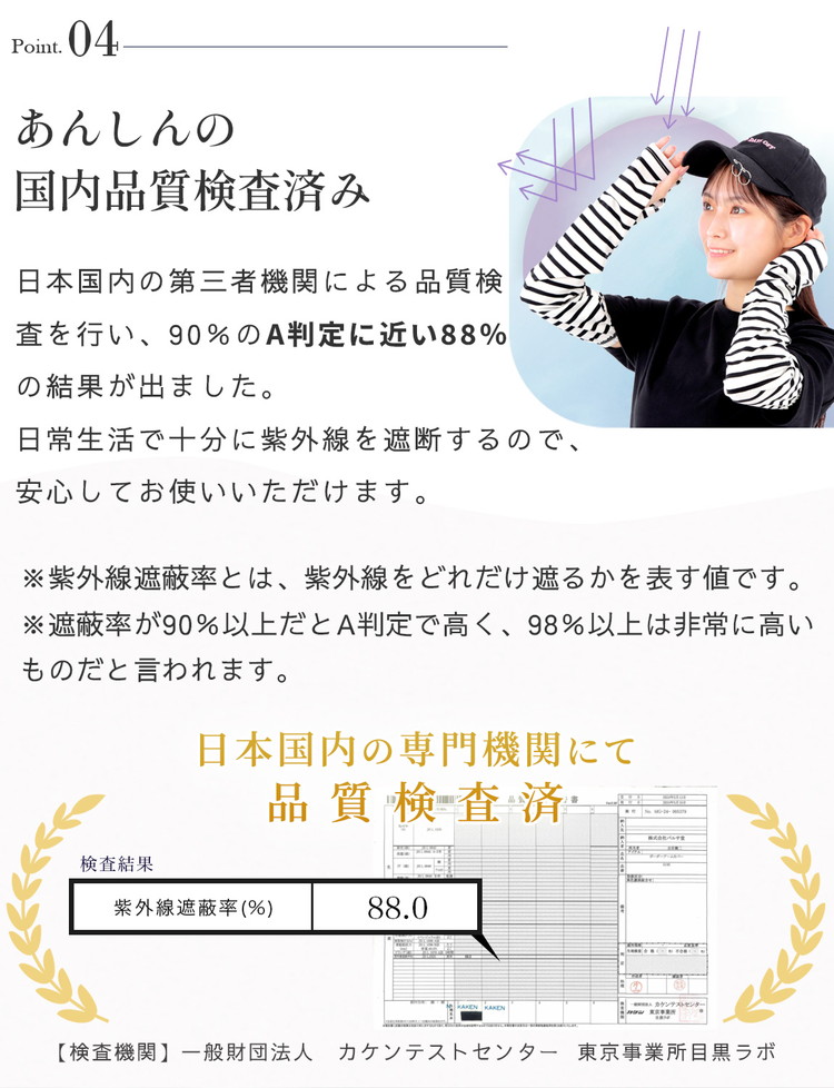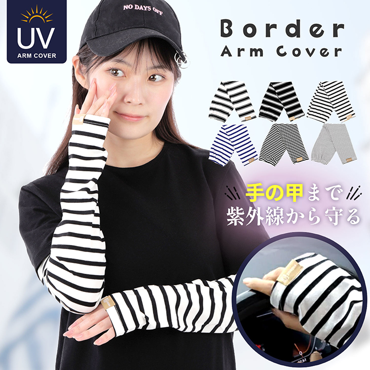 腕全体を紫外線からしっかりガードする幅広タイプのボーダーアームカバーです