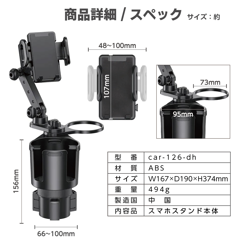 | ◆品番:car-126-dh ◆カラー:ブラック ◆サイズ:W167mm×D190mm×H374mm ◆重量:約494g ◆素材:ABS ◆製造国:中国 ◆保証期間:初期不良(商品到着後2週間)のみ対応 ■商品内容 スマホホルダー本体 【2in1デザインと省スペース】 最新のスマホホルダー付き車用ドリンクホルダーです!! コーヒーカップ・スマホをしっかり固定することができます。 自由自在に動くかすことができ設置方法は無限大! カップホルダーが追加されコーヒーなどを置ける部分が増えました。 ■スマホ対応サイズ 約幅48mm〜10mm ※取り付けるスマートフォンのエッジによって、しっかりと固定できない場合があります。 ■ドリンクホルダー対応サイズ ◆内径約66〜100mm、深さ約47mm以上のドリンクホルダーにセット可能です。 ■カップホルダー対応サイズ ◆口径7.3cm以上のカップに対応しています。それ以下のカップは使用できませんのでご注意ください 参考:コンビニコーヒーSサイズ:約8〜8.3cm・有名チェーン店3社のSサイズ:約8.2cm〜9cmほど 【注意事項】 ※カップホルダーに装着する際は必ずサイズをご確認下さい。 ※輸入品の為、輸送の際に生じるキズ・汚れ・箱潰れがある場合がございます。 ※サイズ・重量は、多少の誤差が生じる場合がございます。 ※輸入品につき、予告なく商品の仕様やパッケージが変わることがございます。 キーワード: ドリンクホルダー スマホホルダー カップホルダー 車載 車中泊 スマホスタンド 便利 カー用品 スタンド 自由調節 携帯ホルダー 360回転 |