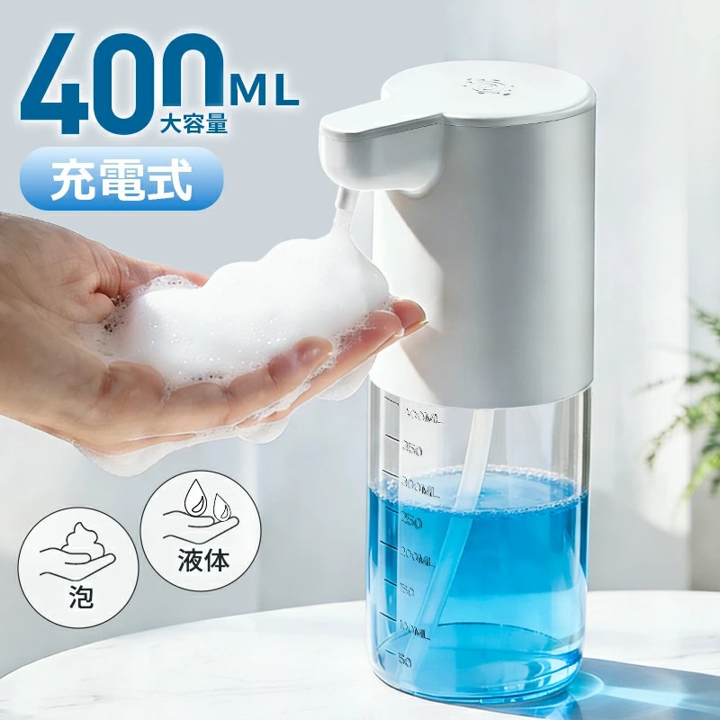 【クーポンで2580円】ソープディスペンサー 自動 泡 液体 充電式 2way置け 壁掛け 4段階 IPX5防水 オートソープディスペンサー 詰め替え 400ml Type-c充電