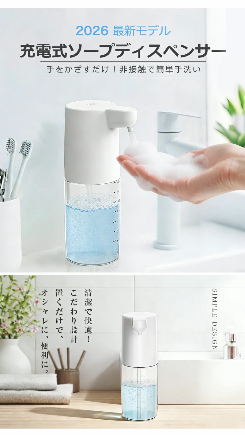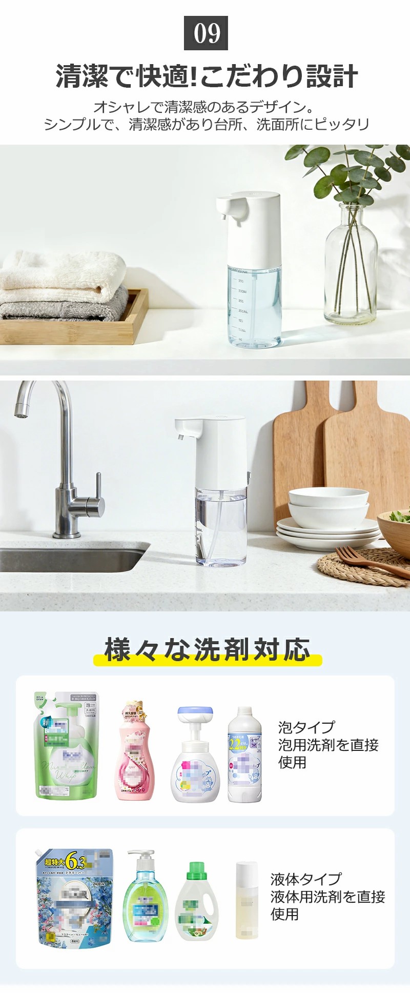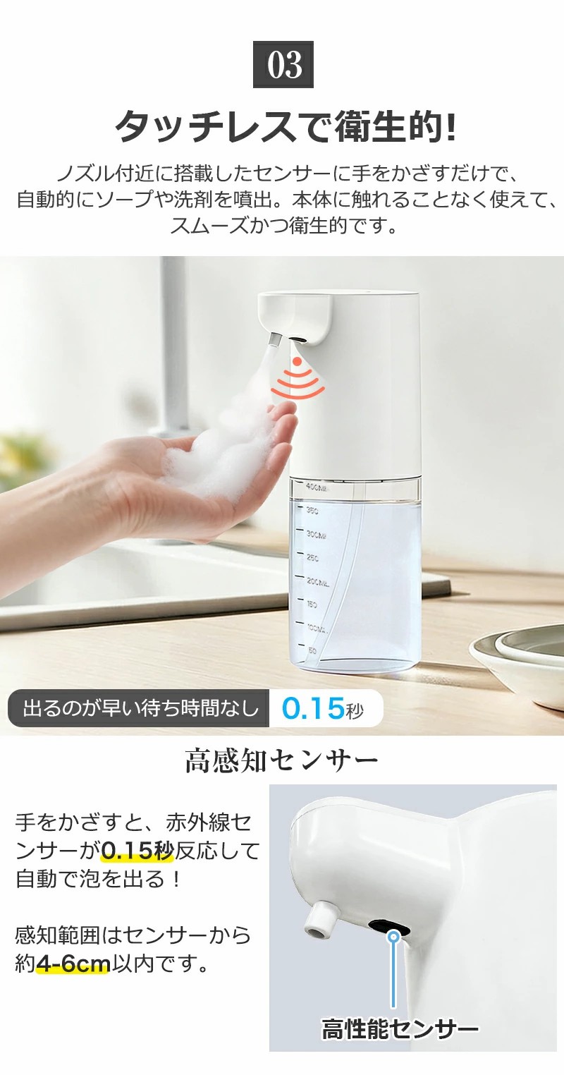 手をかざすだけで自動吐出。泡・液体両対応で、キッチンや洗面所でも清潔に使用できます。